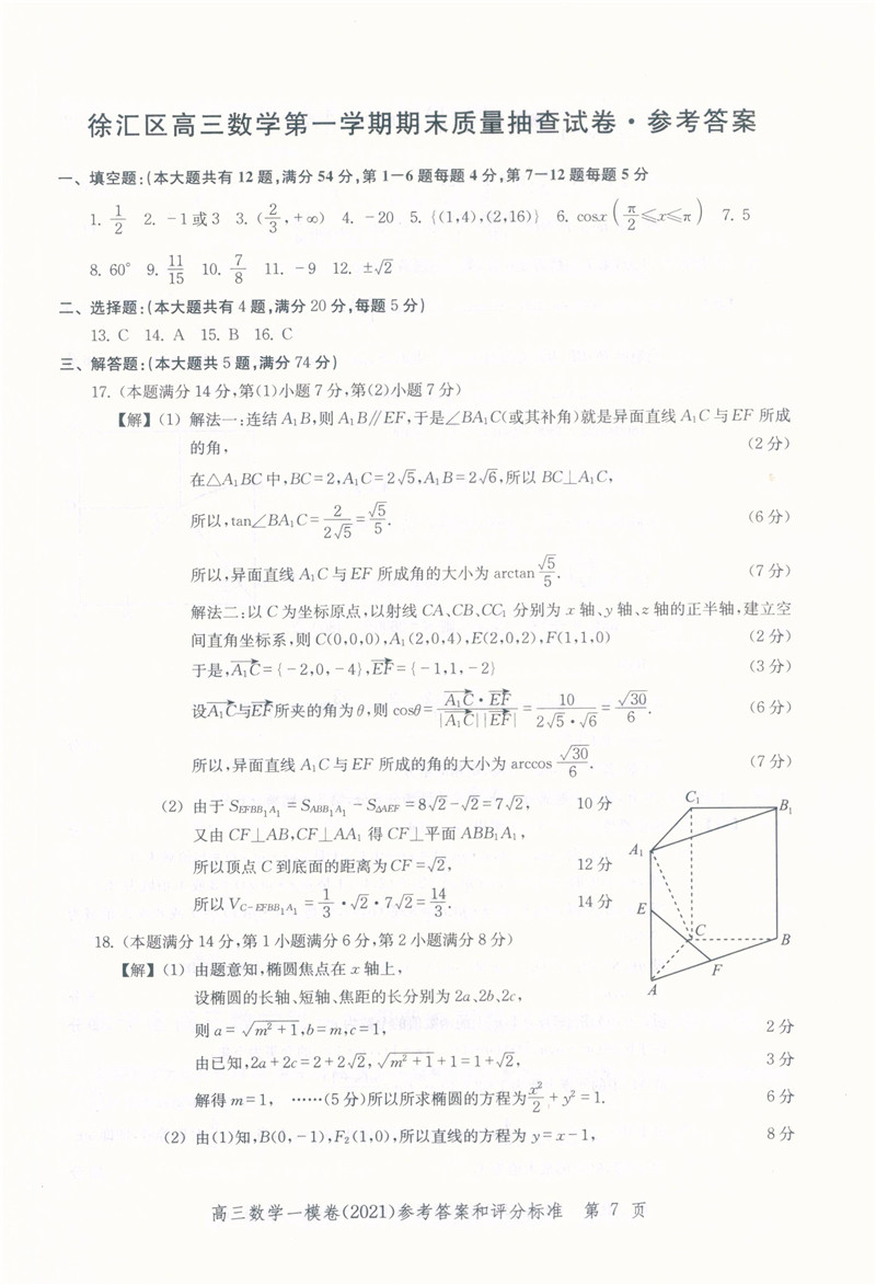 文化课强化训练 上海高考一模卷 仅答案 2021版 配套试卷另拍 上海市高三第一学期期末质量抽查试卷 领先一步 参考答案 现货 数学