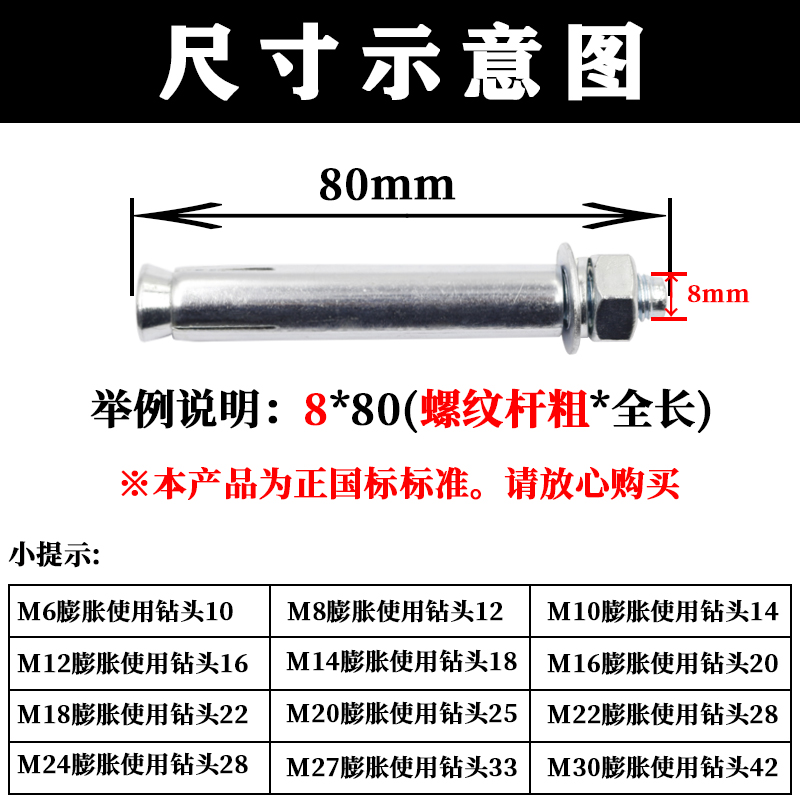 加长膨胀螺丝大全 拉爆10mm国标外膨胀螺栓镀锌铁膨胀管M8M10M12