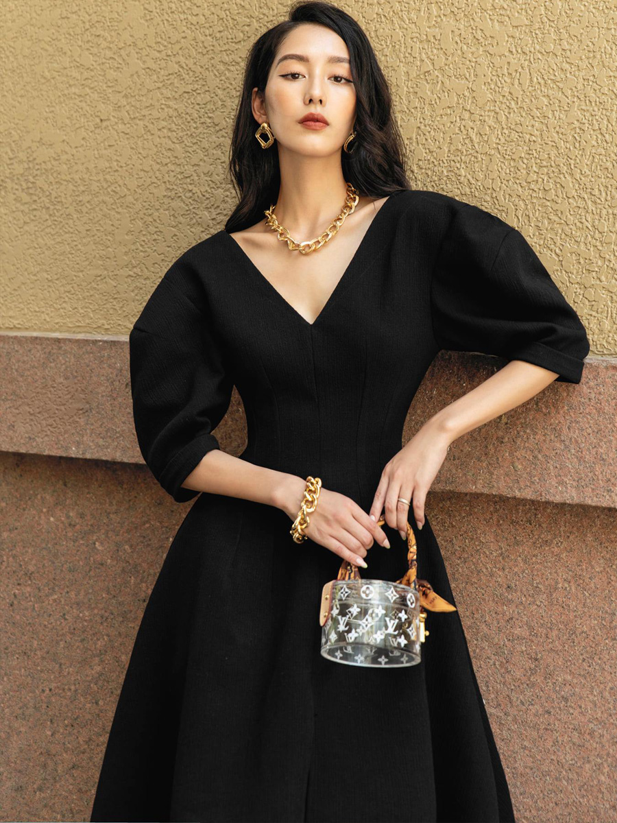 复古高级气质修身 朗姿法式 长袖 长裙冬季 黑色连衣裙 新款 免定金