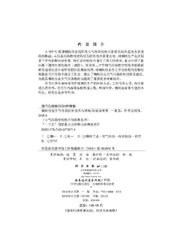 科学出版 正版 朱廷钰等 钢铁行业大气污染控制技术与策略 社 现货