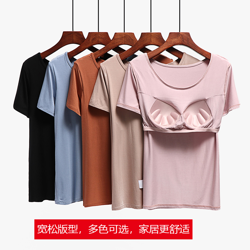女免文胸一体式 薄款 短袖 家居服大码 夏 短裤 蕊瑟纯色带胸垫睡衣套装