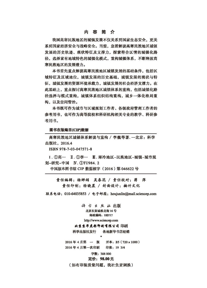 高寒民族地区城镇体系解读与重构科学出版 社