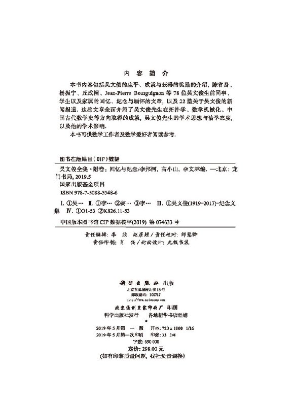 回忆与纪念 科学出版 李邦河 李文林编 社龙门书局 高小山 吴文俊全集·附卷