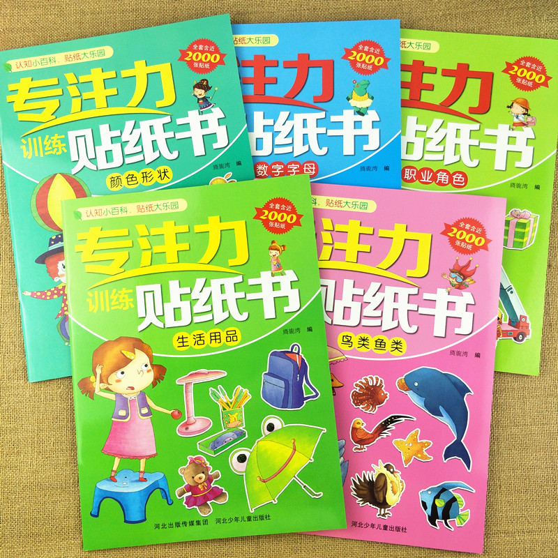 专注力贴纸书5本学前儿童提高专注力记忆力玩具锻炼小孩子专注力 书数字字母颜色鸟类鱼类职业角色培养孩子左右脑开发注意力训练