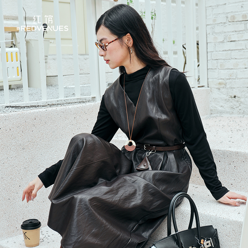 红馆2025秋冬新款 气质中长裙 连衣裙两件套黑色V领pu皮连衣裙长袖