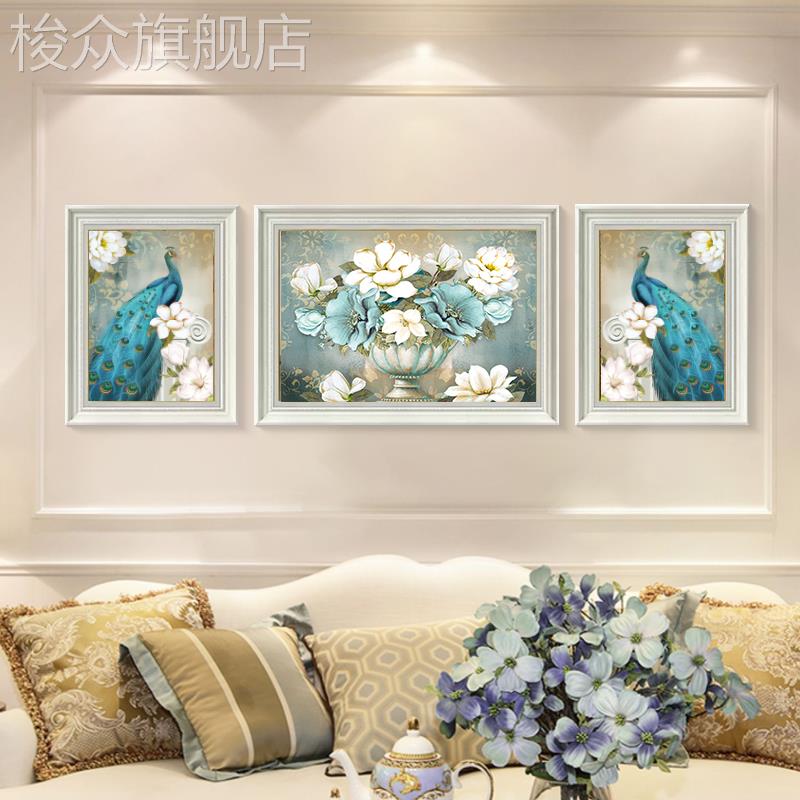 欧式 饰画孔雀花卉壁画现代简约沙发背景墙三联画大气挂画 客厅装
