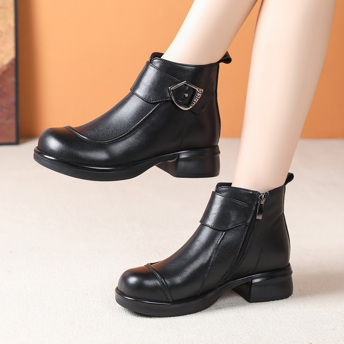 中年妈妈鞋 子加绒棉鞋 粗跟软底马丁靴子 秋冬鞋 真皮短靴女2025新款