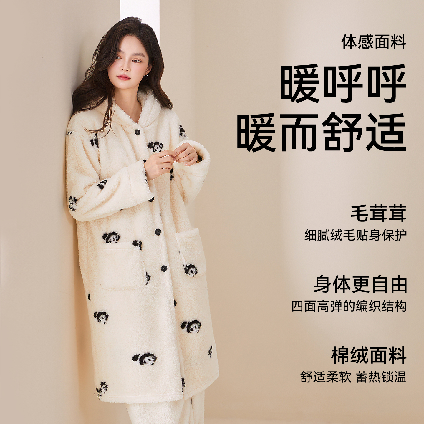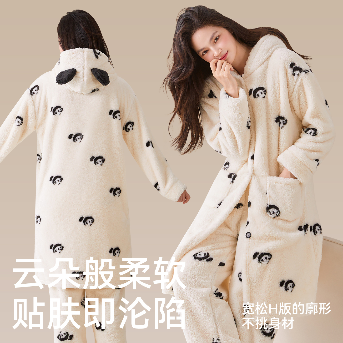 大码 春秋开衫 女士家居服 加厚珊瑚绒睡衣女冬法兰绒加绒套装 秋冬季