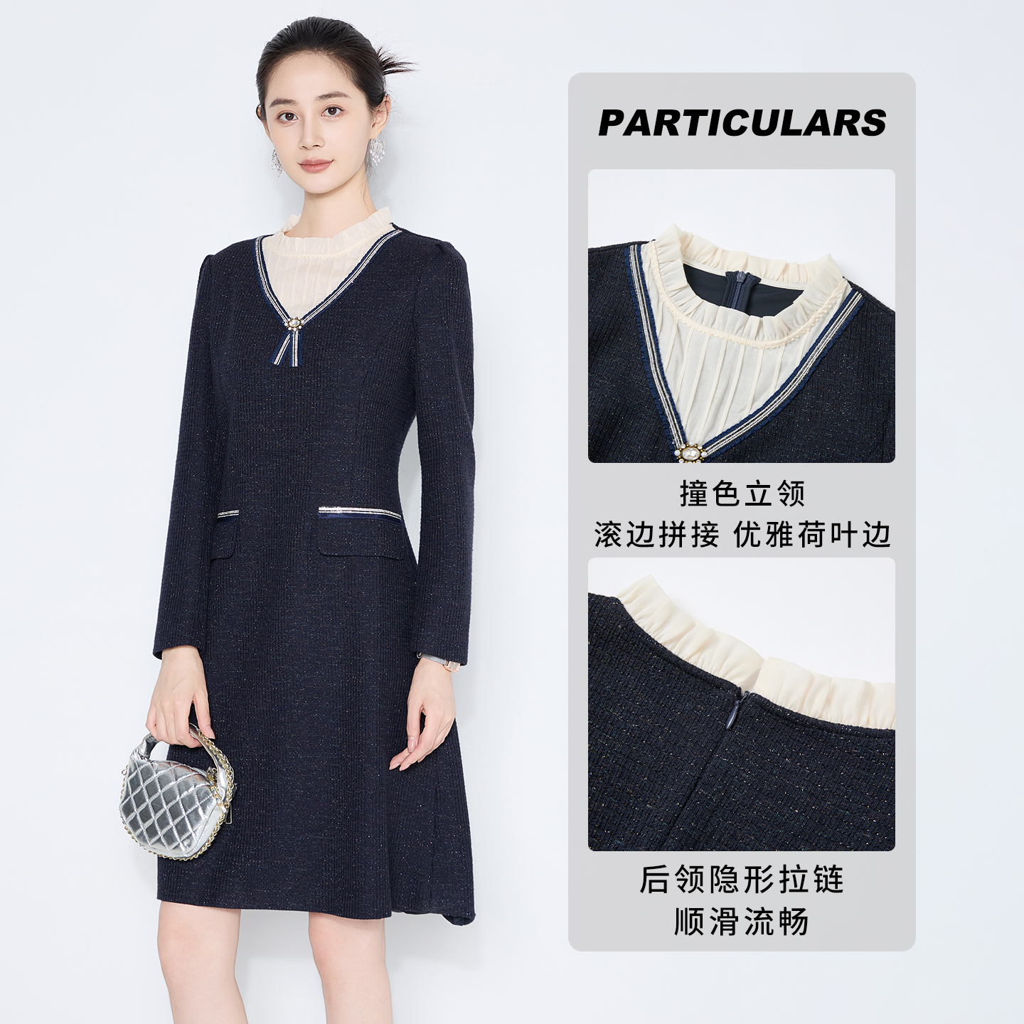 女 收腰连衣裙子气质时尚 马天奴2025秋冬新款 藏青色花边领拼接长袖