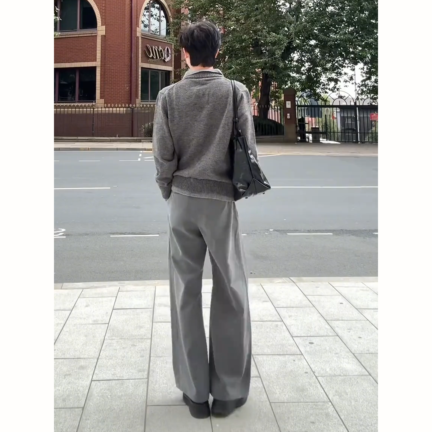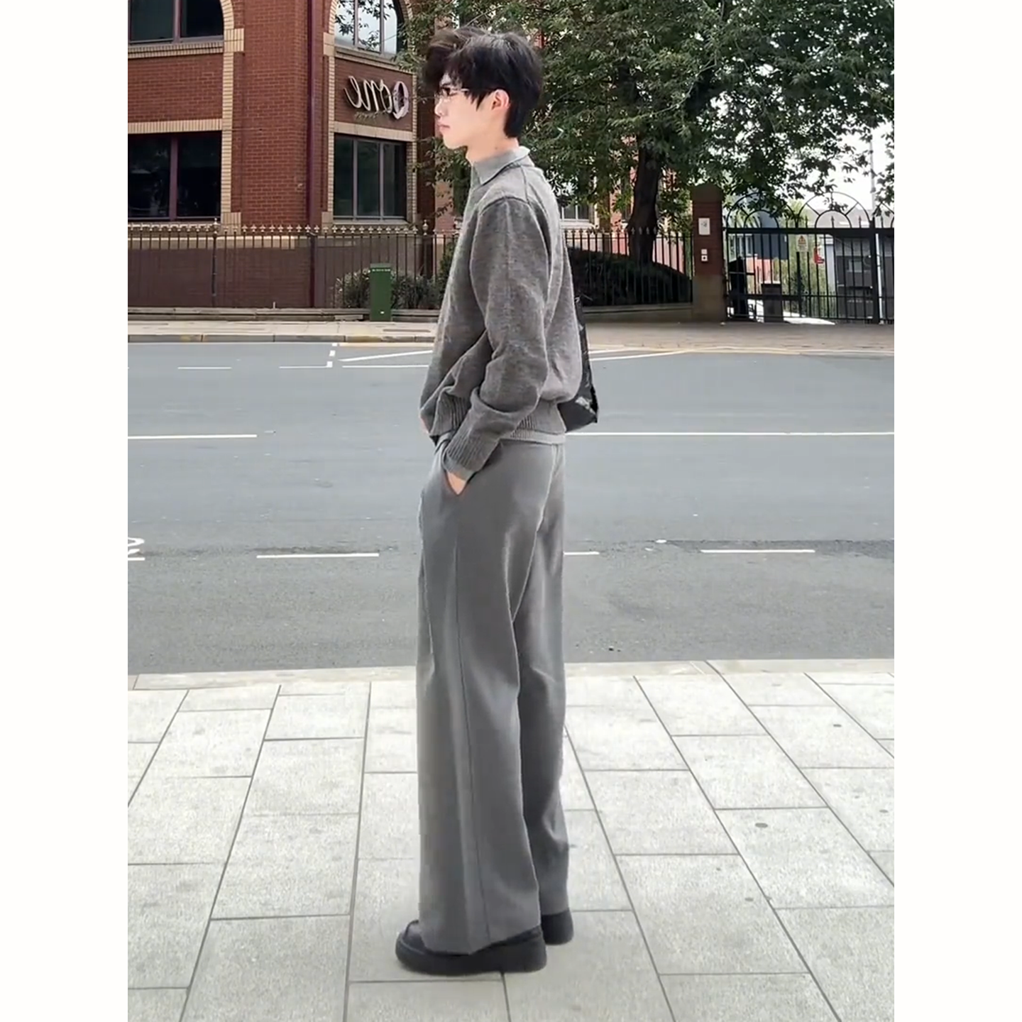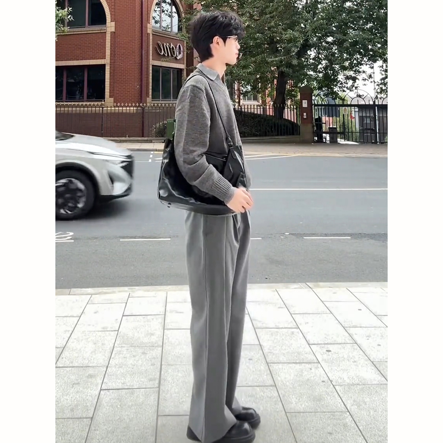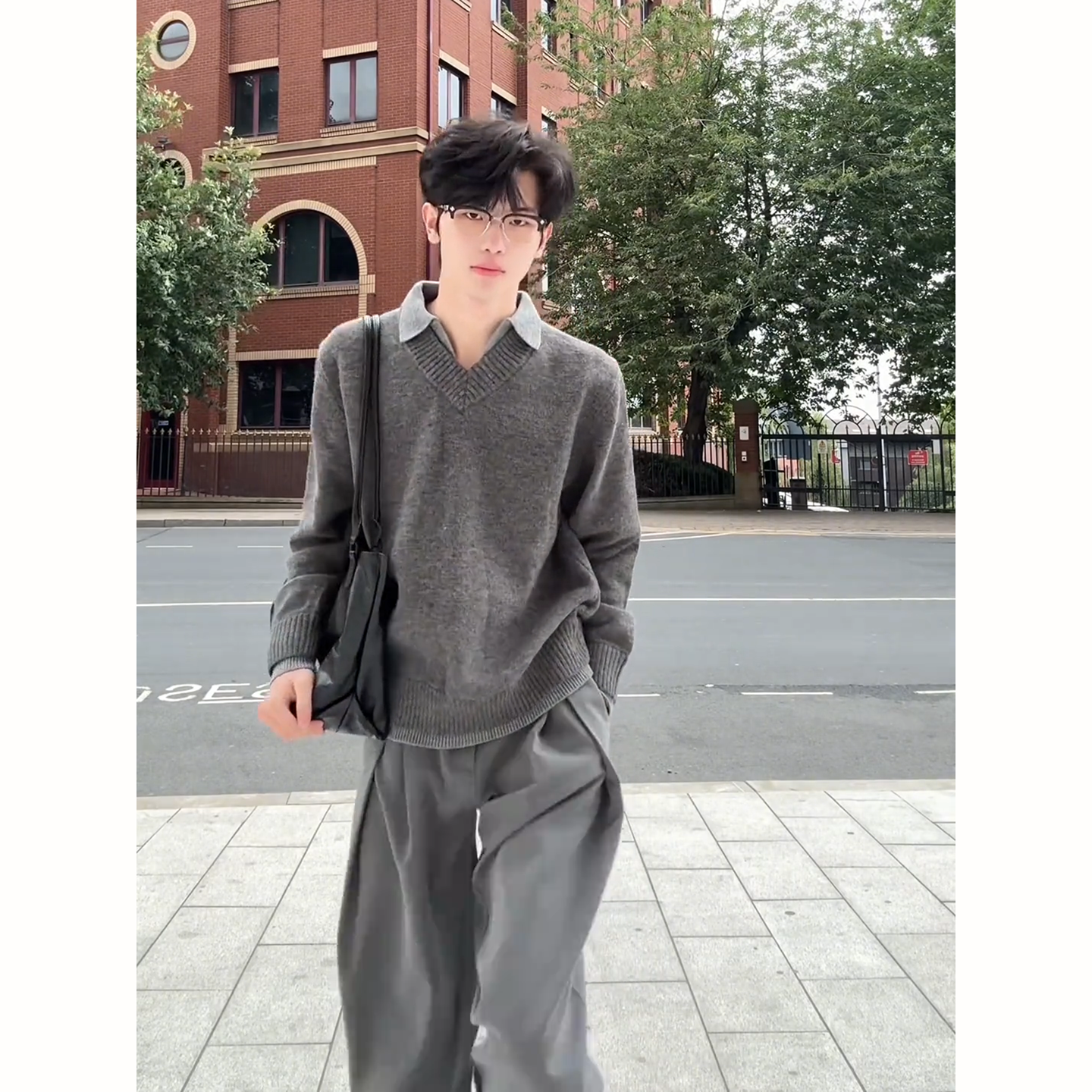 老钱风男生潮流穿搭套装 设计感假两件v领毛衣搭配A字廓形西裤 秋季