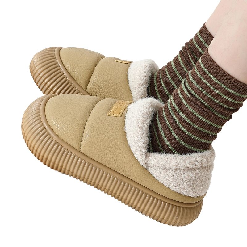秋加绒加厚保暖防滑厚底外穿毛毛绒棉鞋 女款 包跟防水PU棉拖鞋 冬季
