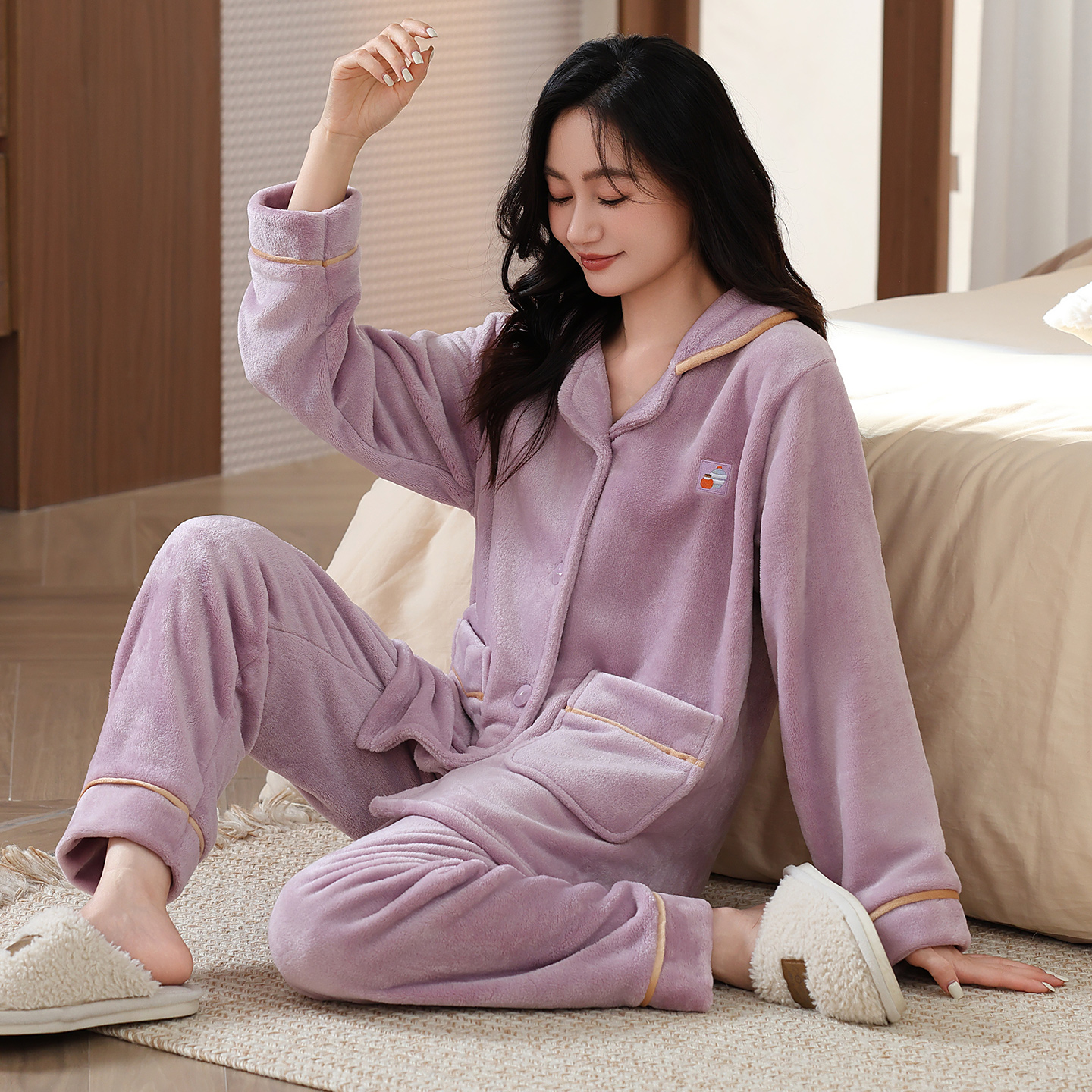 保暖家居服 套装 都市丽人珊瑚绒睡衣女士秋冬季 加绒加厚法兰绒开衫