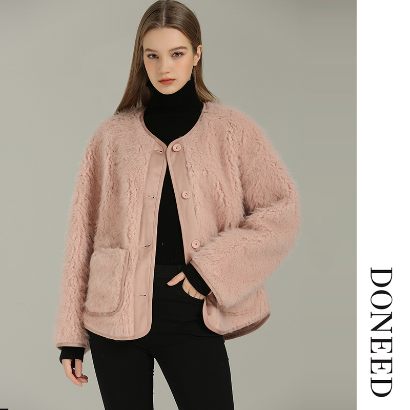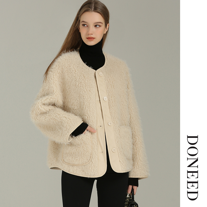 DONEED秋款 小香风温柔气质毛绒外套保暖圆领仿皮毛一体外套女