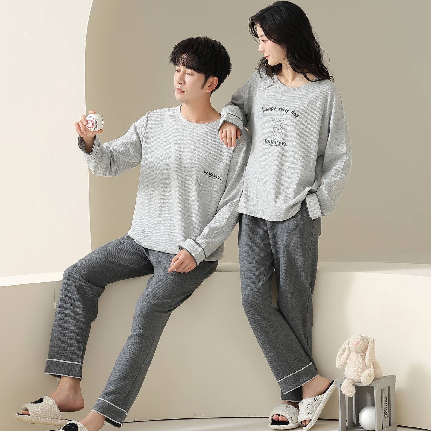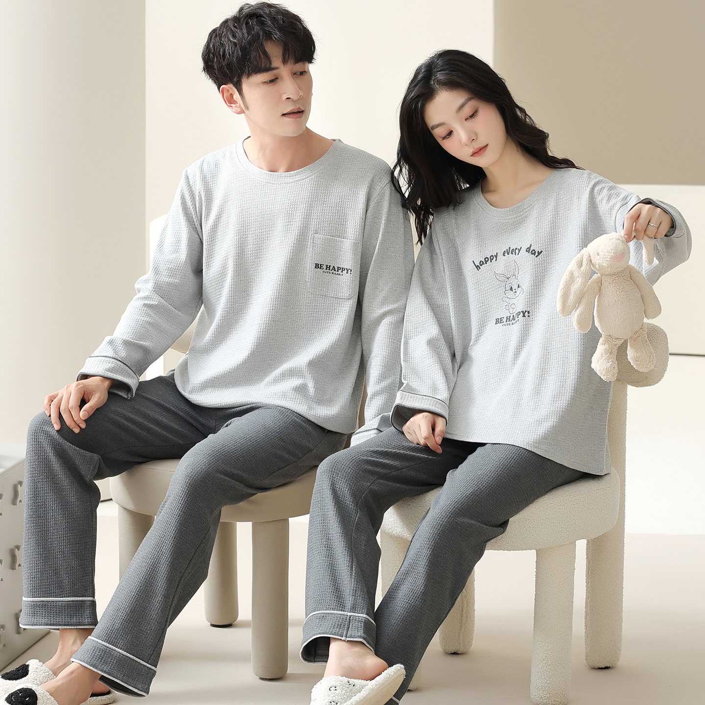 2025新款 女纯棉华夫格灰色男韩版 家居服 长袖 卡之恋情侣睡衣春秋季