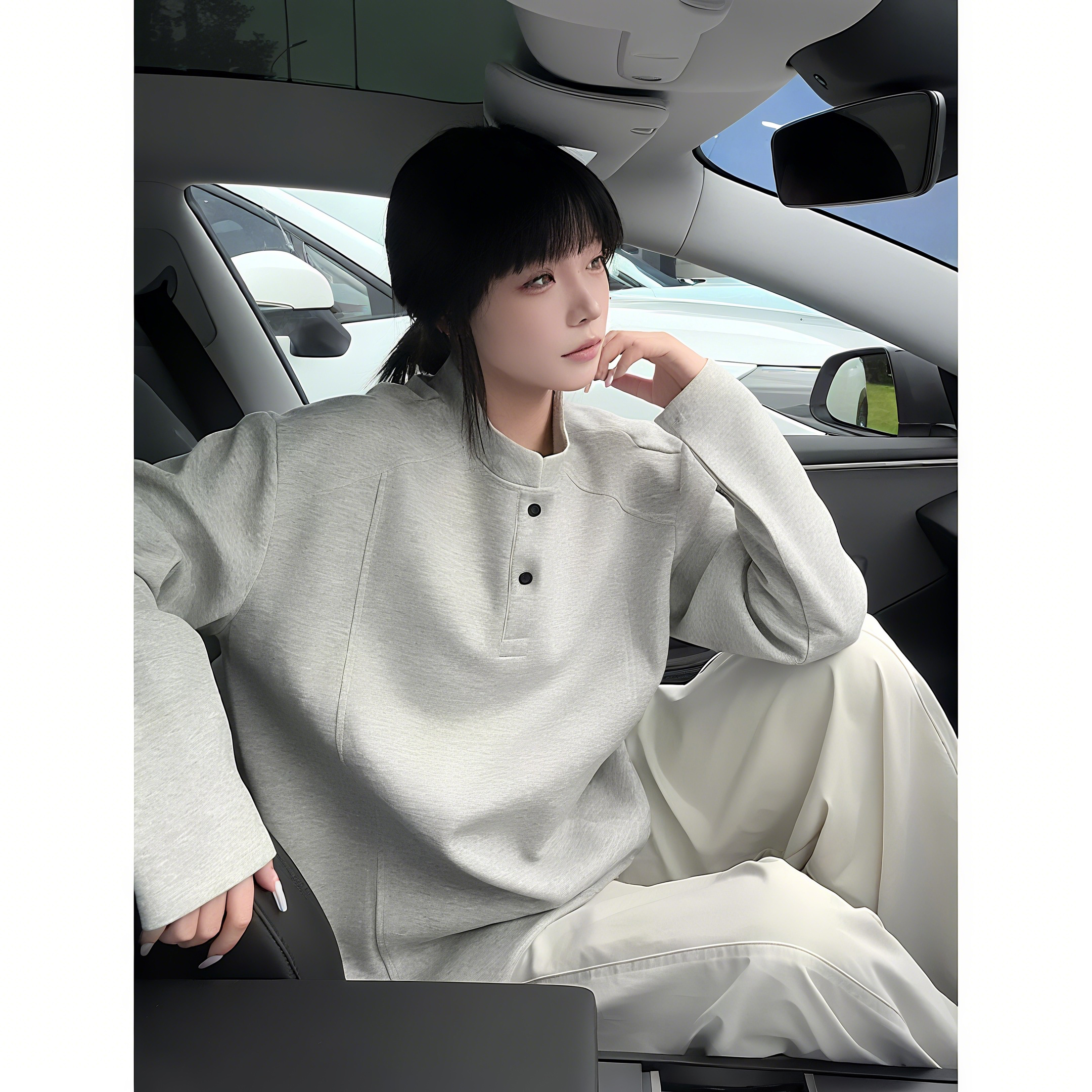 运动立领卫衣重磅拼接内搭打底衫 白灰色亨利领正肩长袖 t恤男秋季