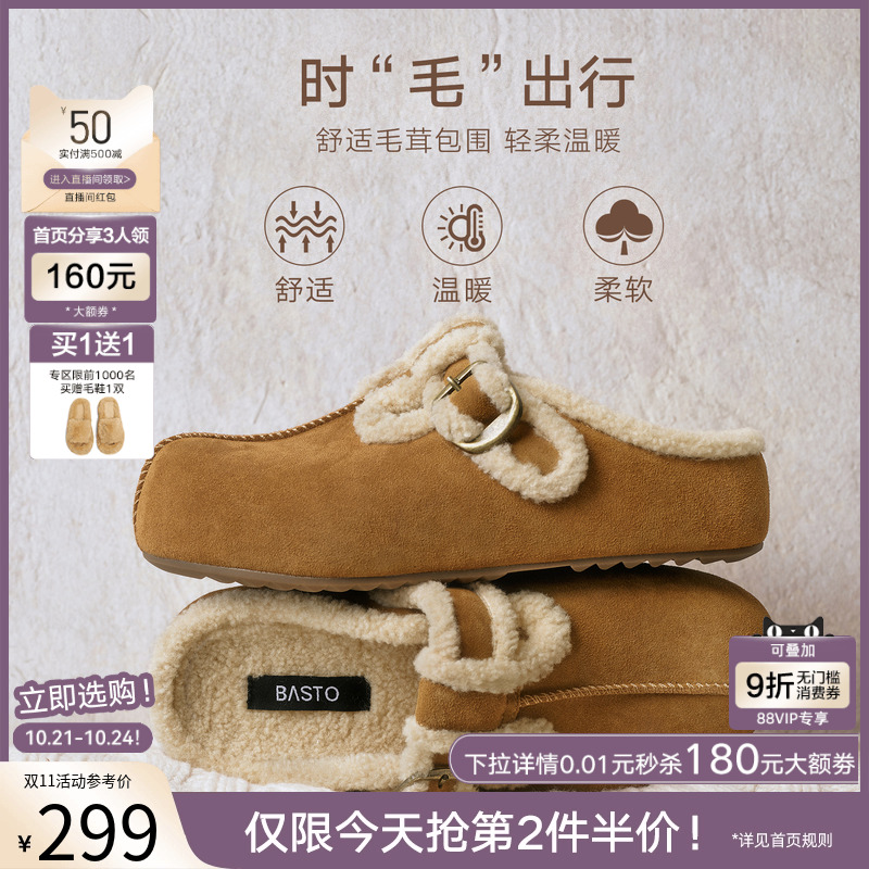 加绒保暖女棉拖鞋 毛毛鞋 V0011DH5 厚底勃肯鞋 百思图2025冬商场新款