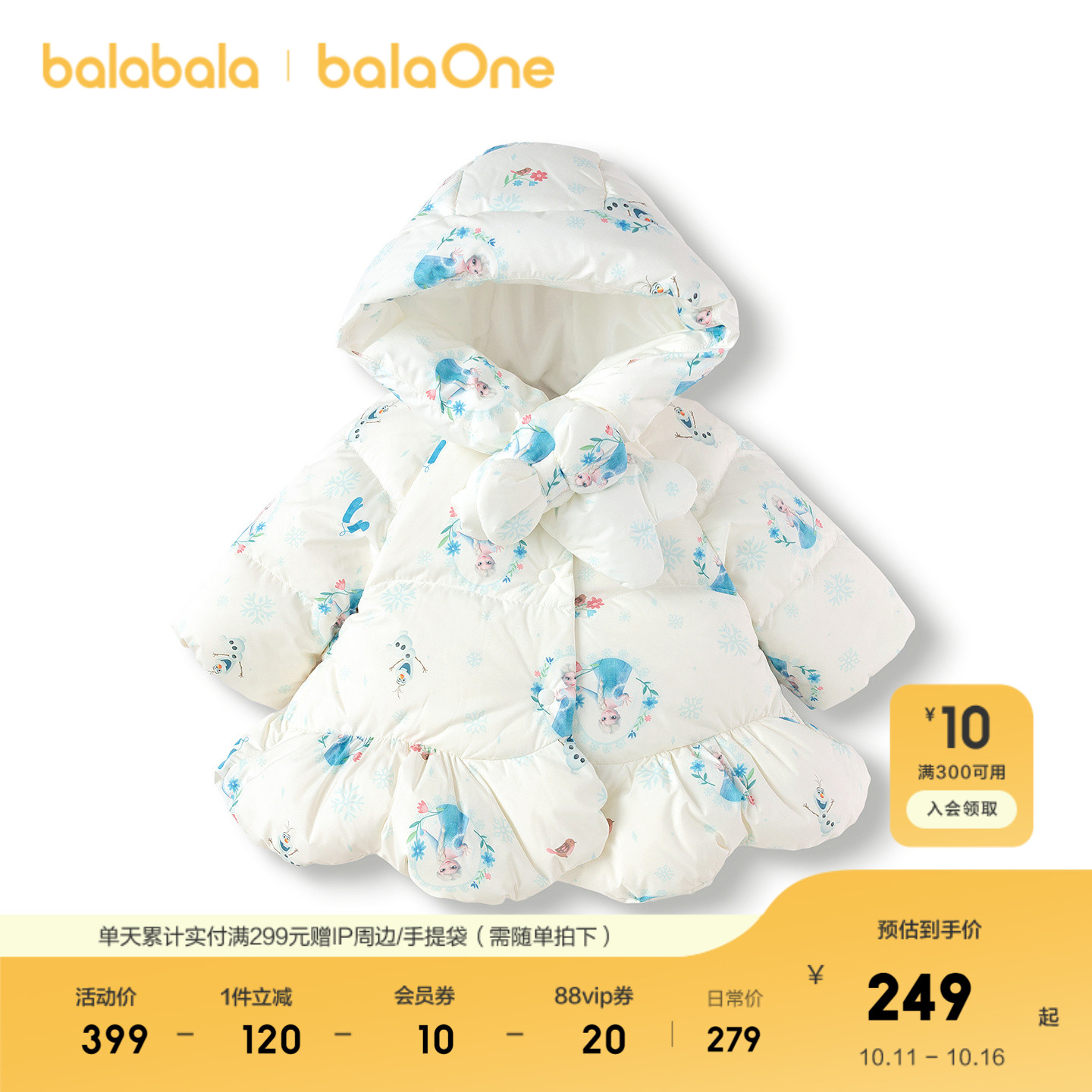 巴拉巴拉女童羽绒服艾莎连帽外套2025新冬装 迪士尼IPbalaOne