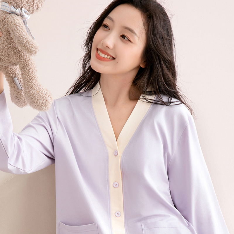 男春秋 带胸垫家居服套装 A类抗菌防螨纯棉情侣睡衣女长袖 红豆夏季