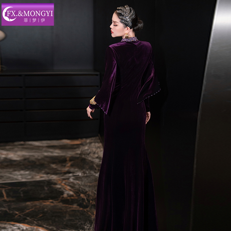 菲梦伊原创钉珠金丝绒连衣裙女秋装 较高级感轻熟性感气质礼服长裙