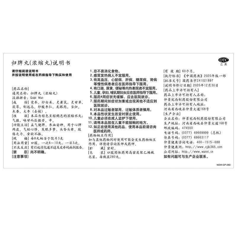 280丸 浓缩丸 1瓶 盒心脾两虚 失眠多梦 仲景 气短心悸 归脾丸