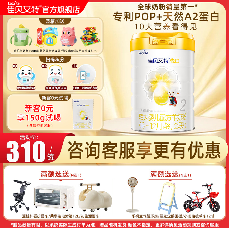 佳贝艾特悦白较大婴儿配方羊奶粉 800g旗舰店 2段