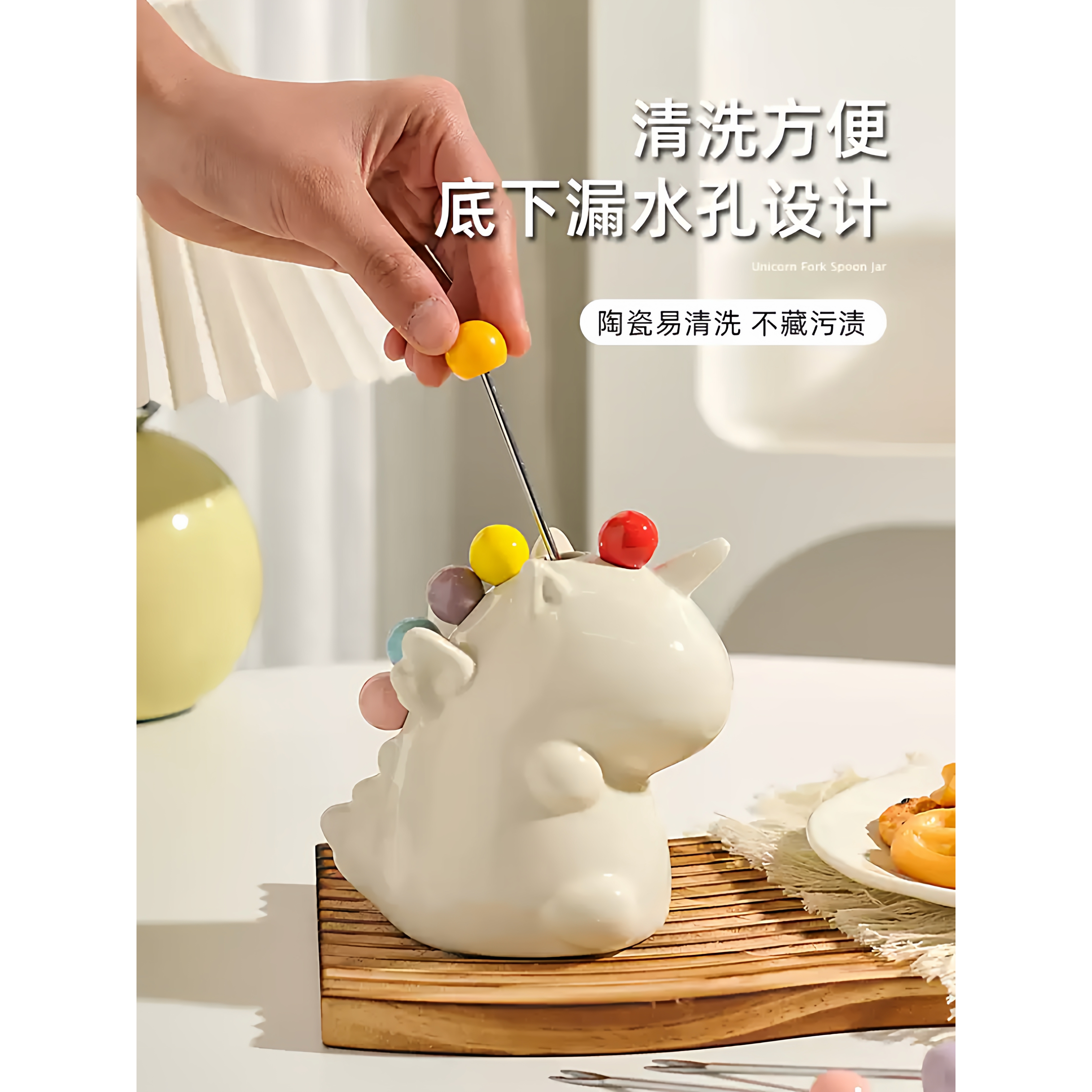 恐龙独角兽不锈钢水果叉家用轻奢高级感儿童安全陶瓷叉子收纳罐