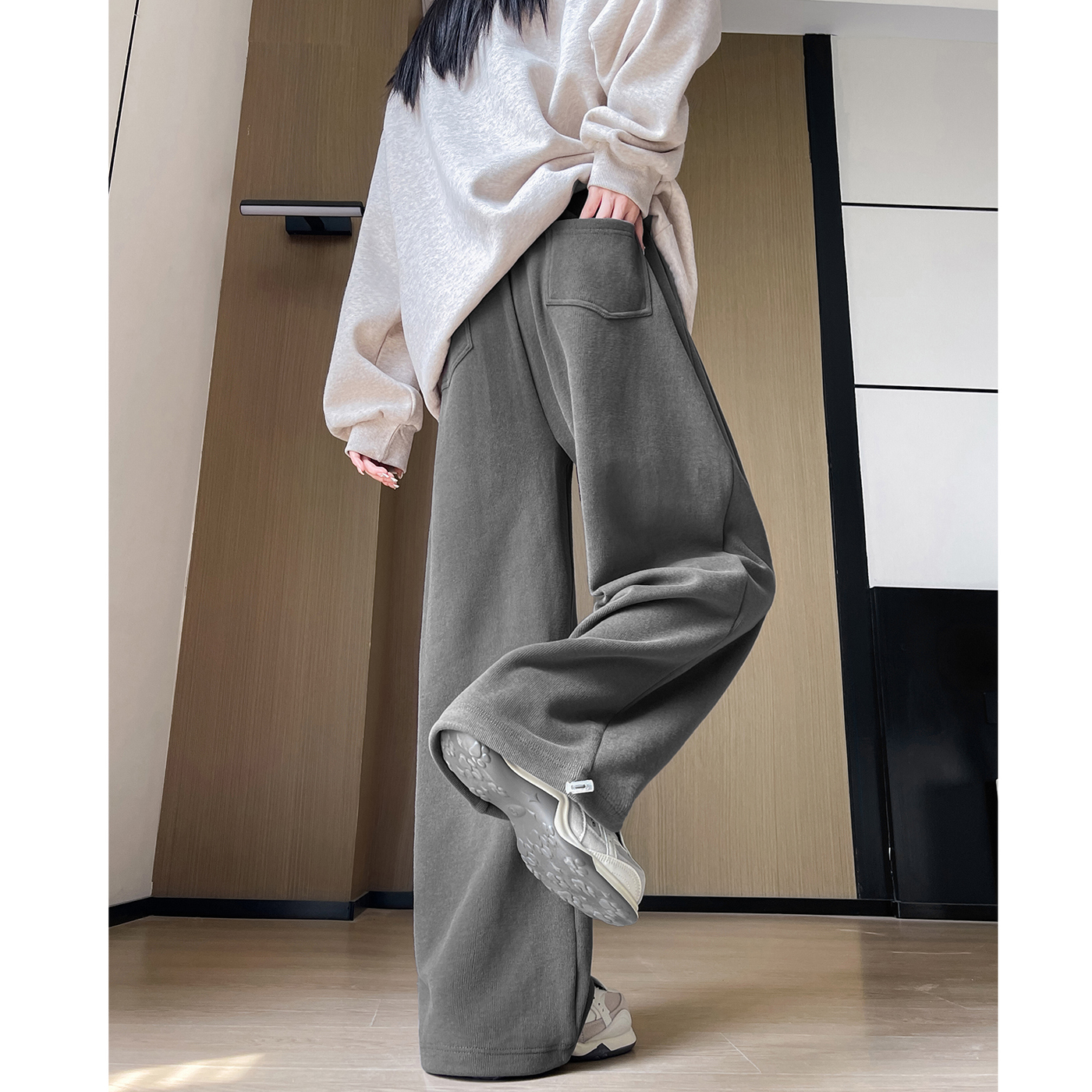 女春秋2025新款 加绒运动裤 冬季 休闲高腰卫裤 美式 灰色羊羔绒阔腿裤