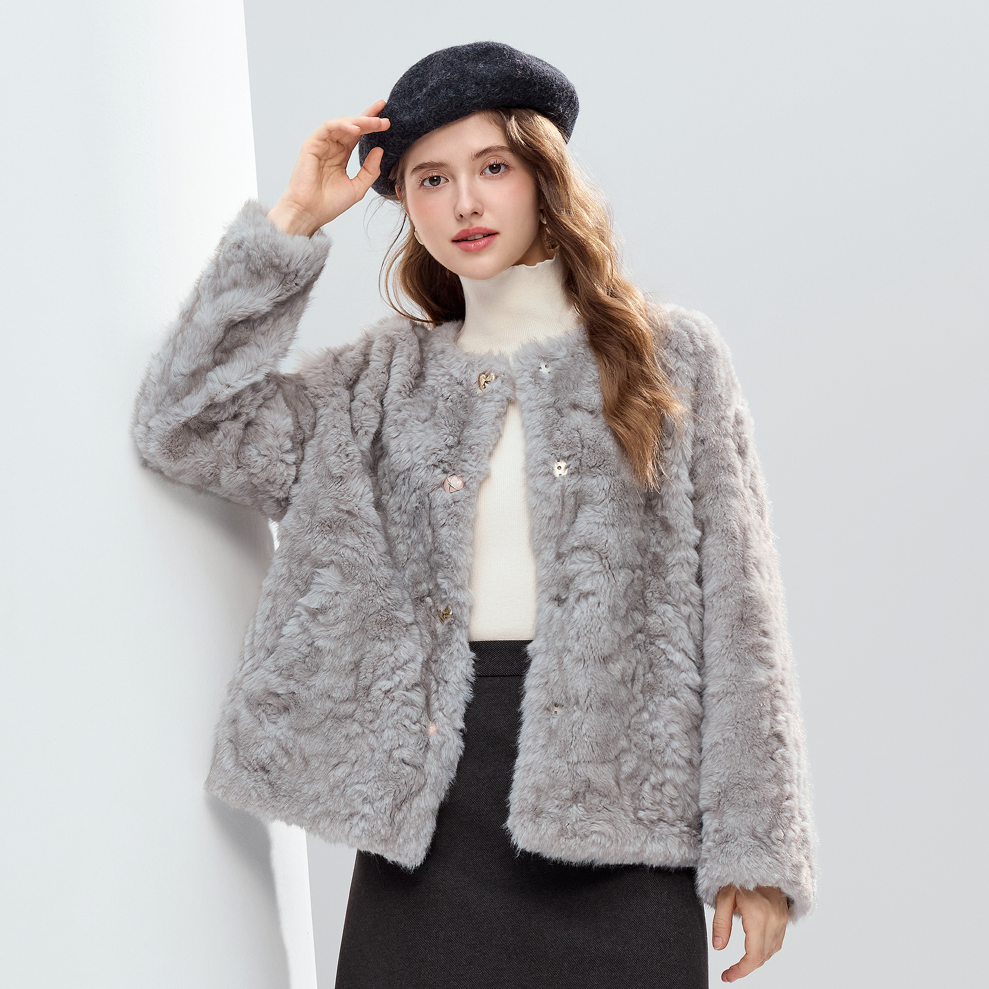 betu百图高级感灰色环保皮草外套女2025年冬季 加厚保暖大衣 新款