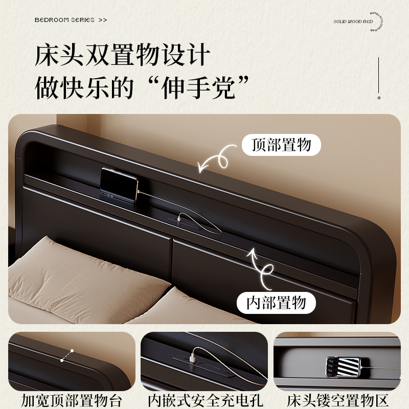 政府补贴馨佰利实木床主卧家具1米8双人床现代简约多功能黑色婚床