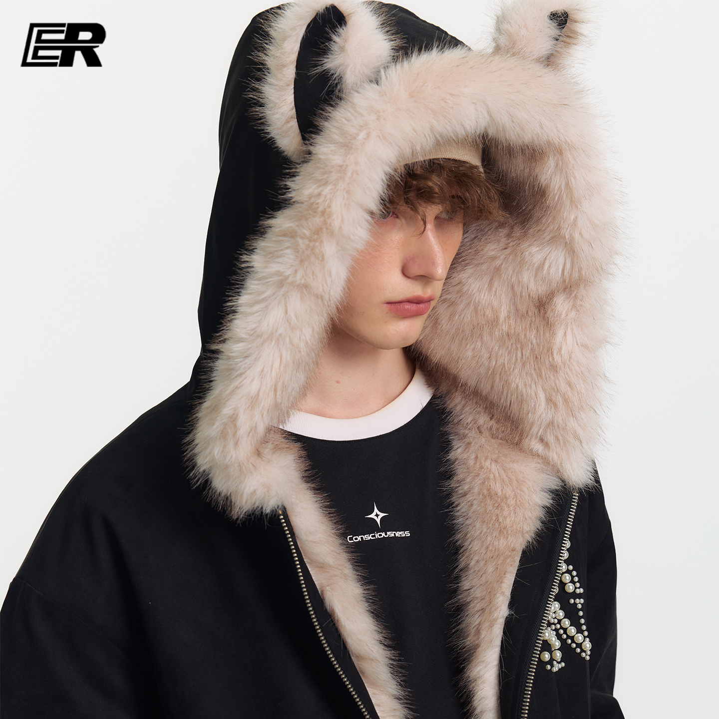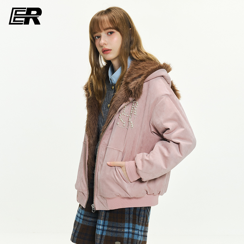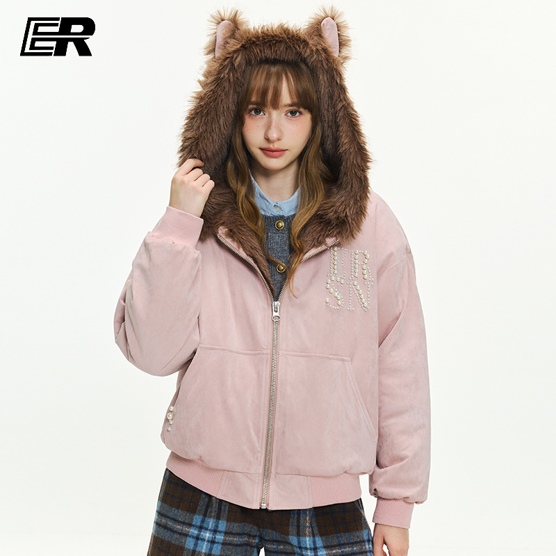 ER兔耳朵座山雕连帽外套2025冬珍珠logo毛领夹克美式 潮牌男女棉服