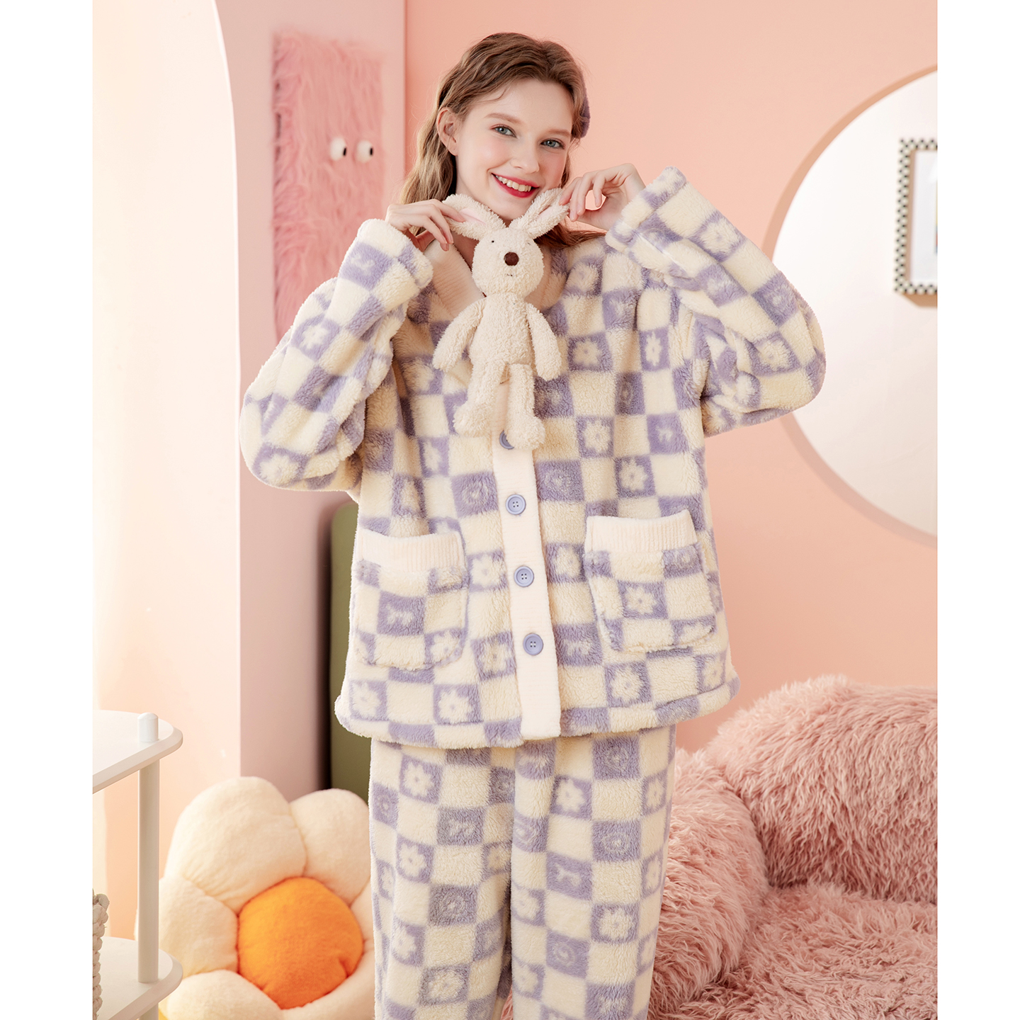 芬腾睡衣女秋冬季 可外穿 紫色高级珊瑚绒宽松舒适家居服套装