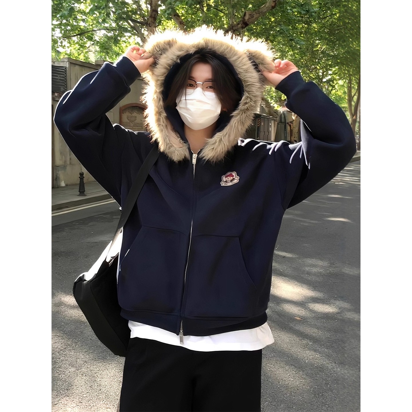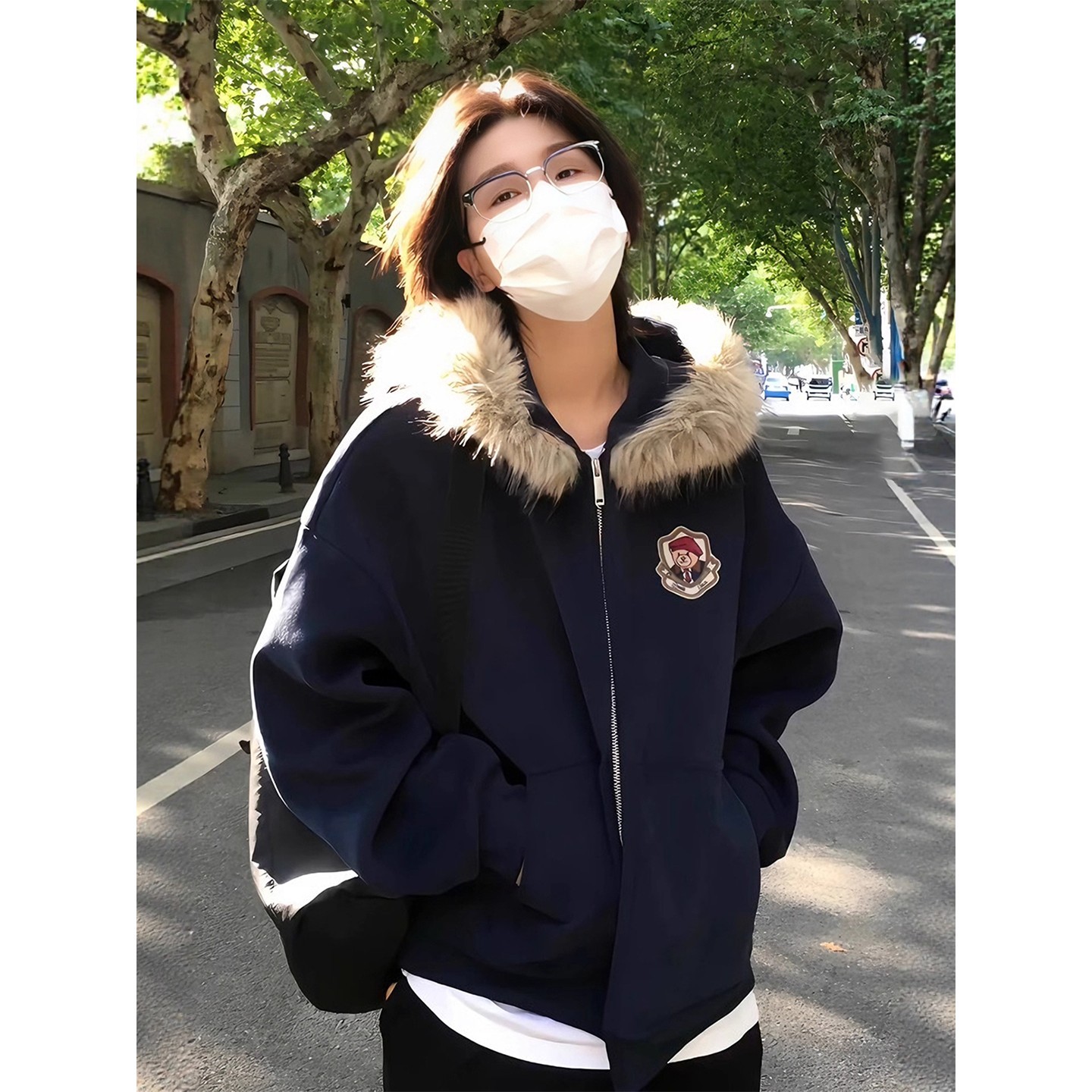 加绒加厚连帽卫衣女秋冬oversize拉链开衫 外套宽松慵懒chic风上衣