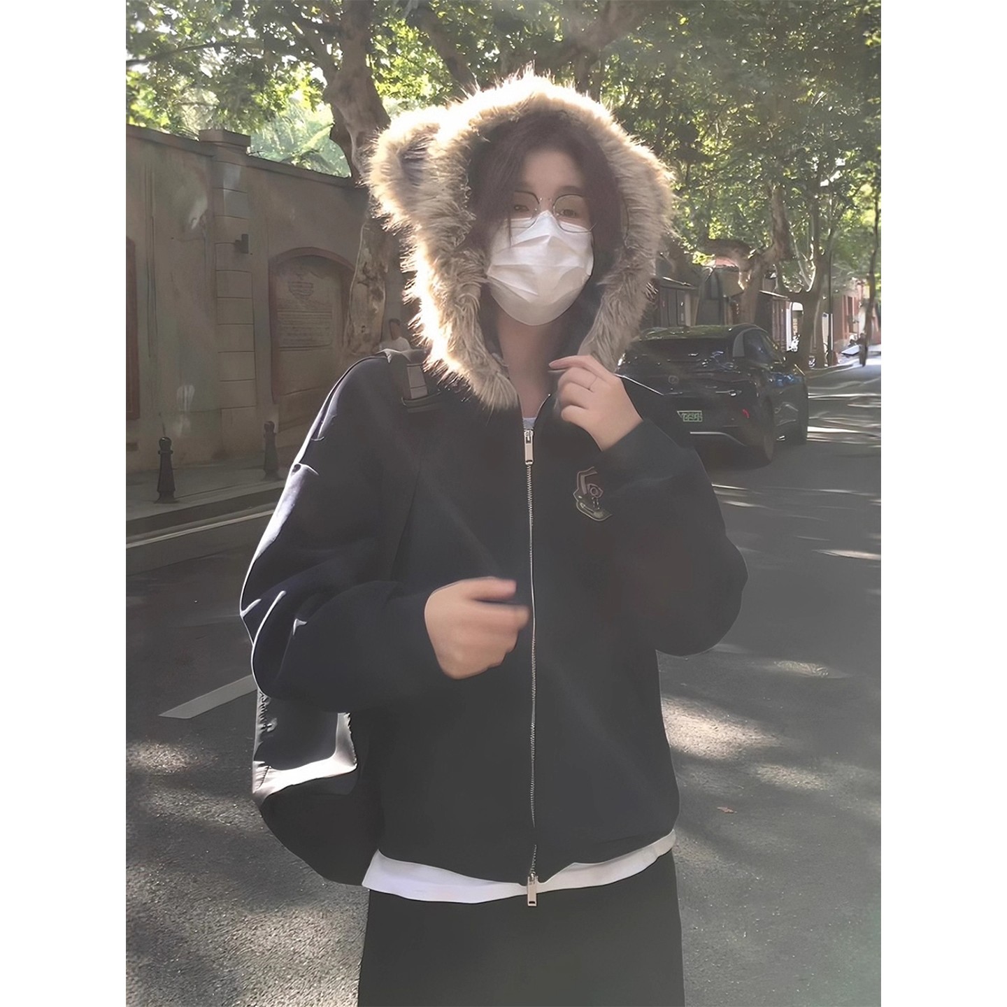 外套 上衣小个子宽松韩系慵懒风连帽开衫 加绒卫衣女2025新款 春秋季