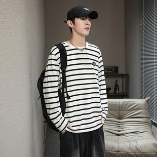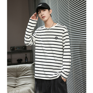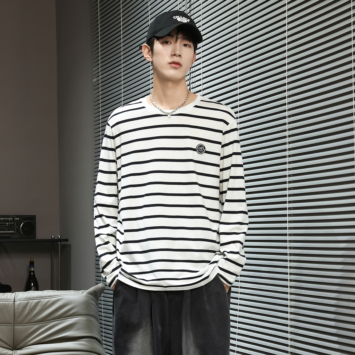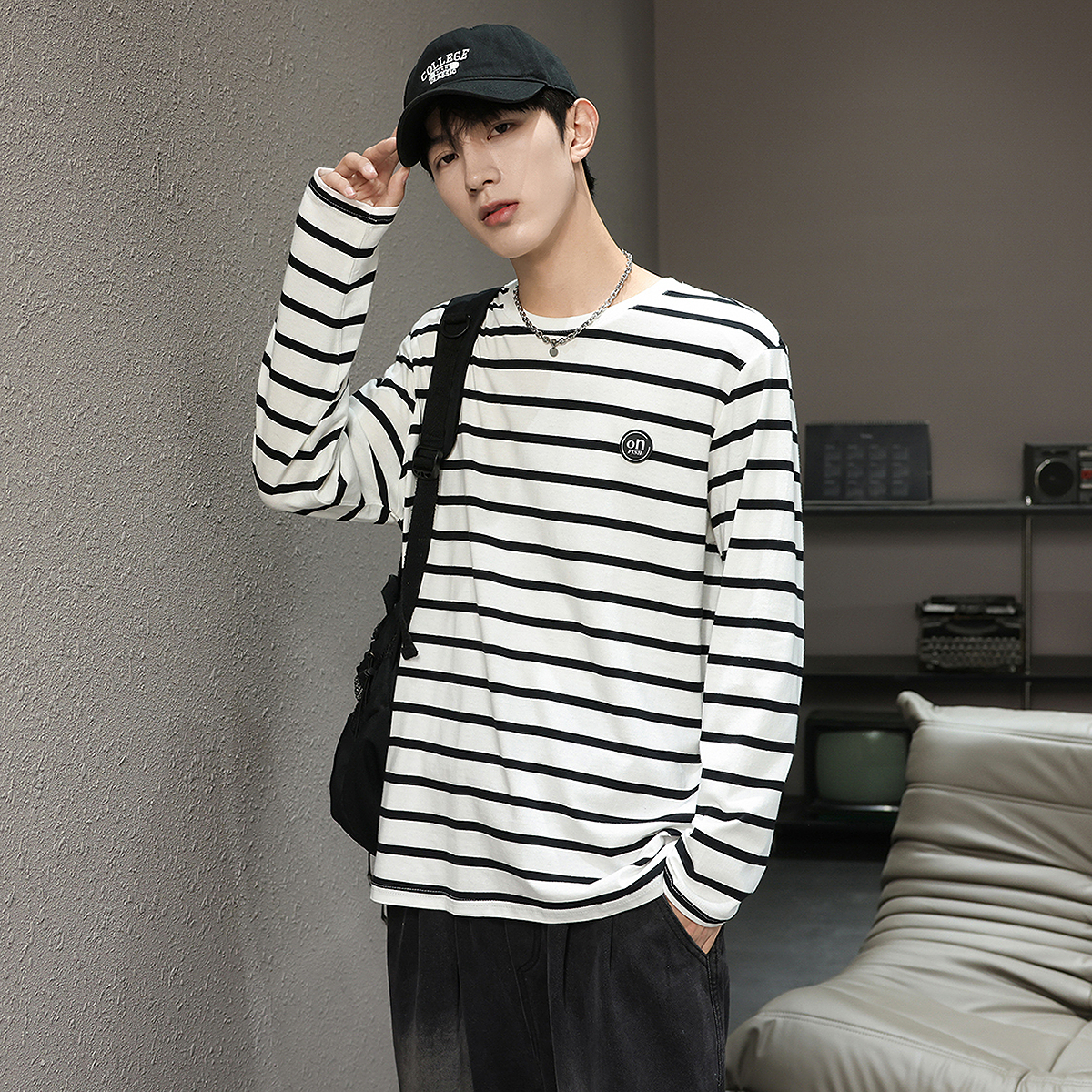长袖 流行风格 T恤秋长袖 男圆领刺绣条纹秋季 上衣男士 唐狮男士