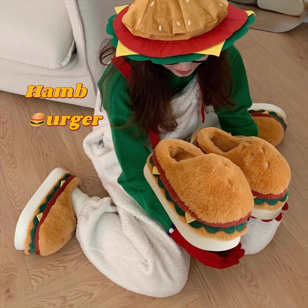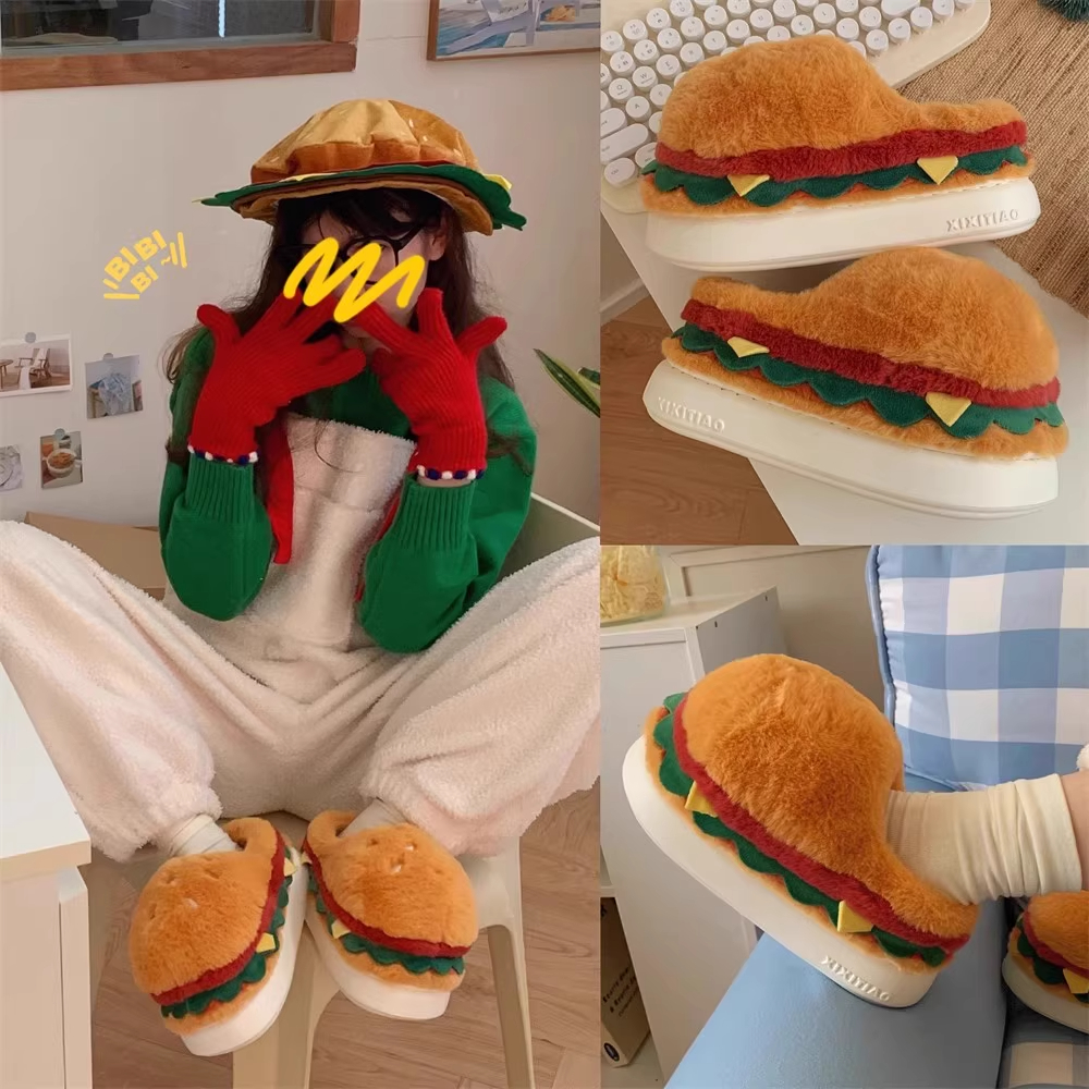 学生创意毛绒保暖情侣家居棉鞋 冬季 女2025新款 日本可爱汉堡棉拖鞋