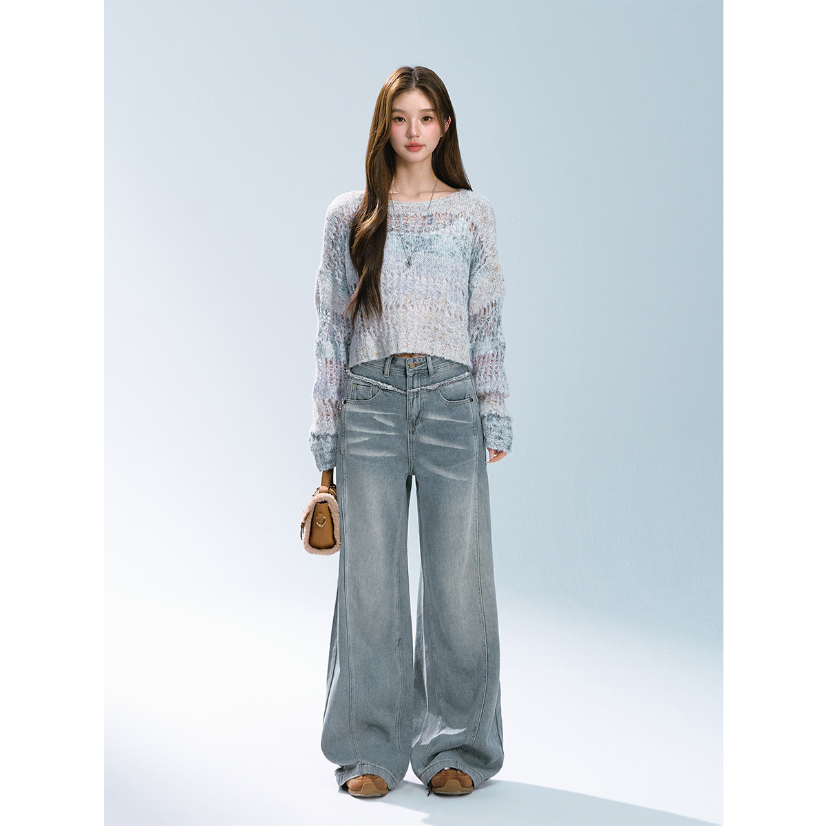女设计感做旧复古遮腿型阔腿休闲长裤 ablueberry 水洗毛边牛仔裤