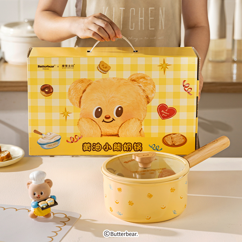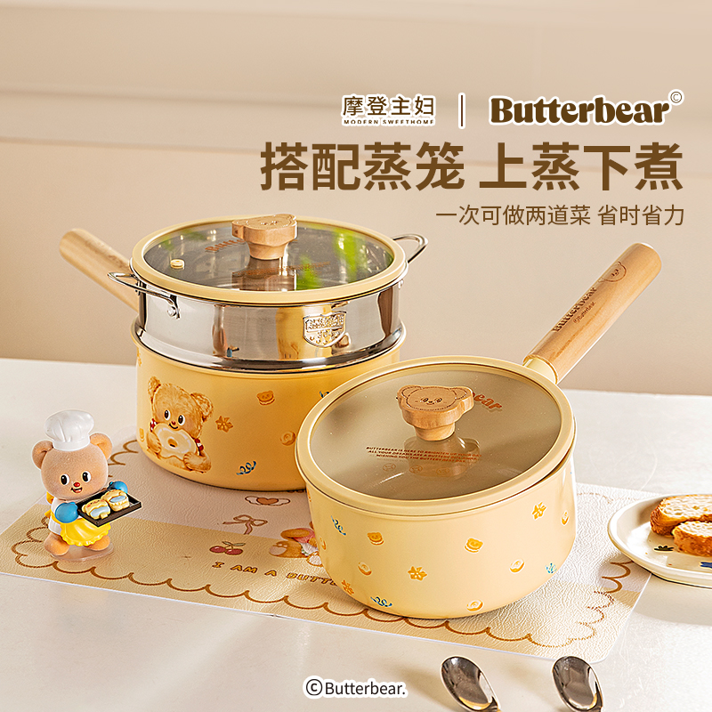 摩登主妇黄油小熊钛陶瓷奶锅婴儿宝宝辅食锅一人食煮泡面小锅蒸锅