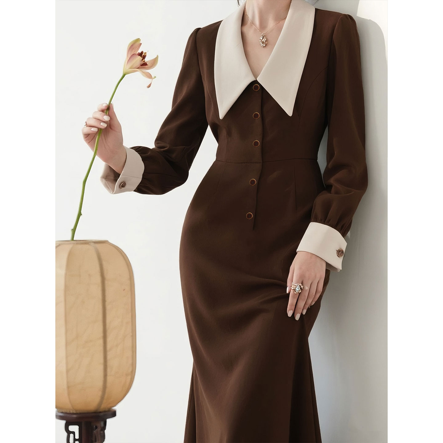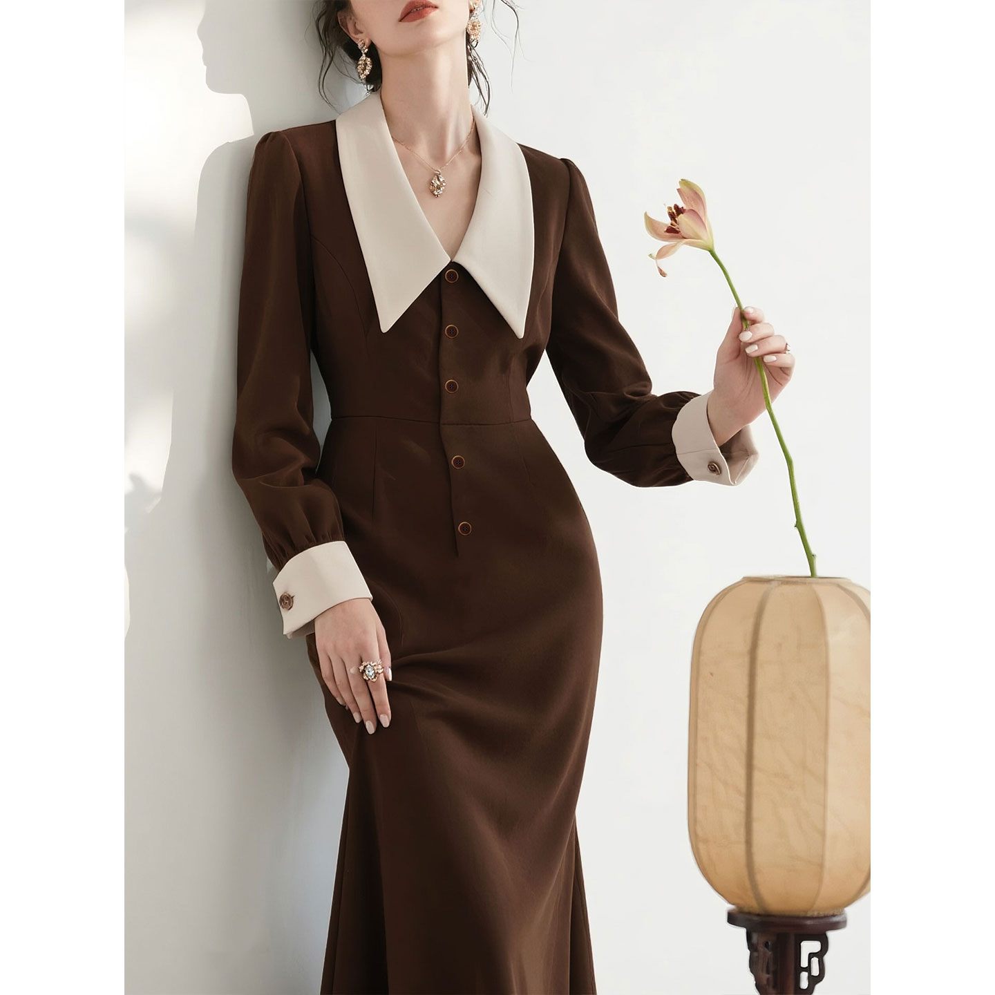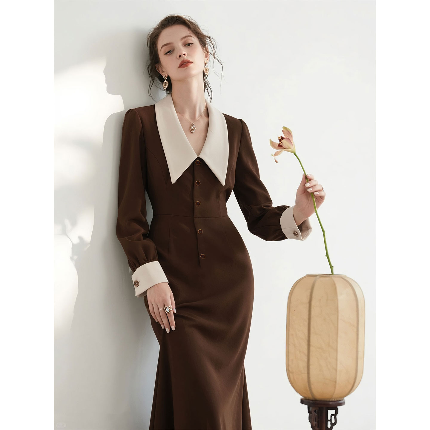 巨好看 法式 长袖 新款 早秋穿搭裙子 赫本风咖色连衣裙女2025年秋季