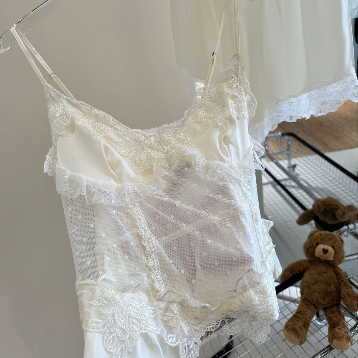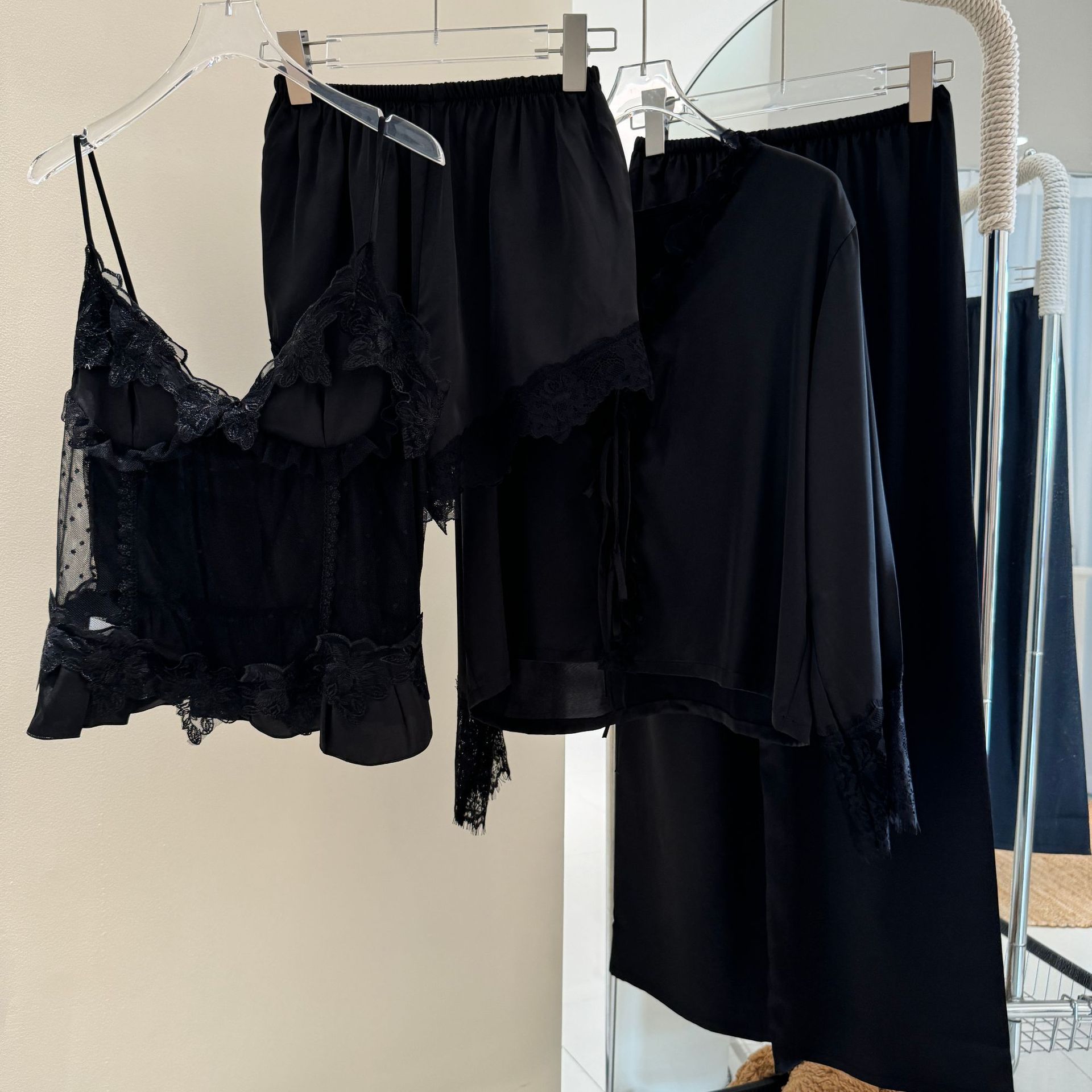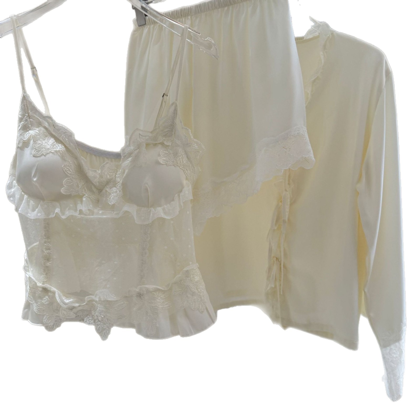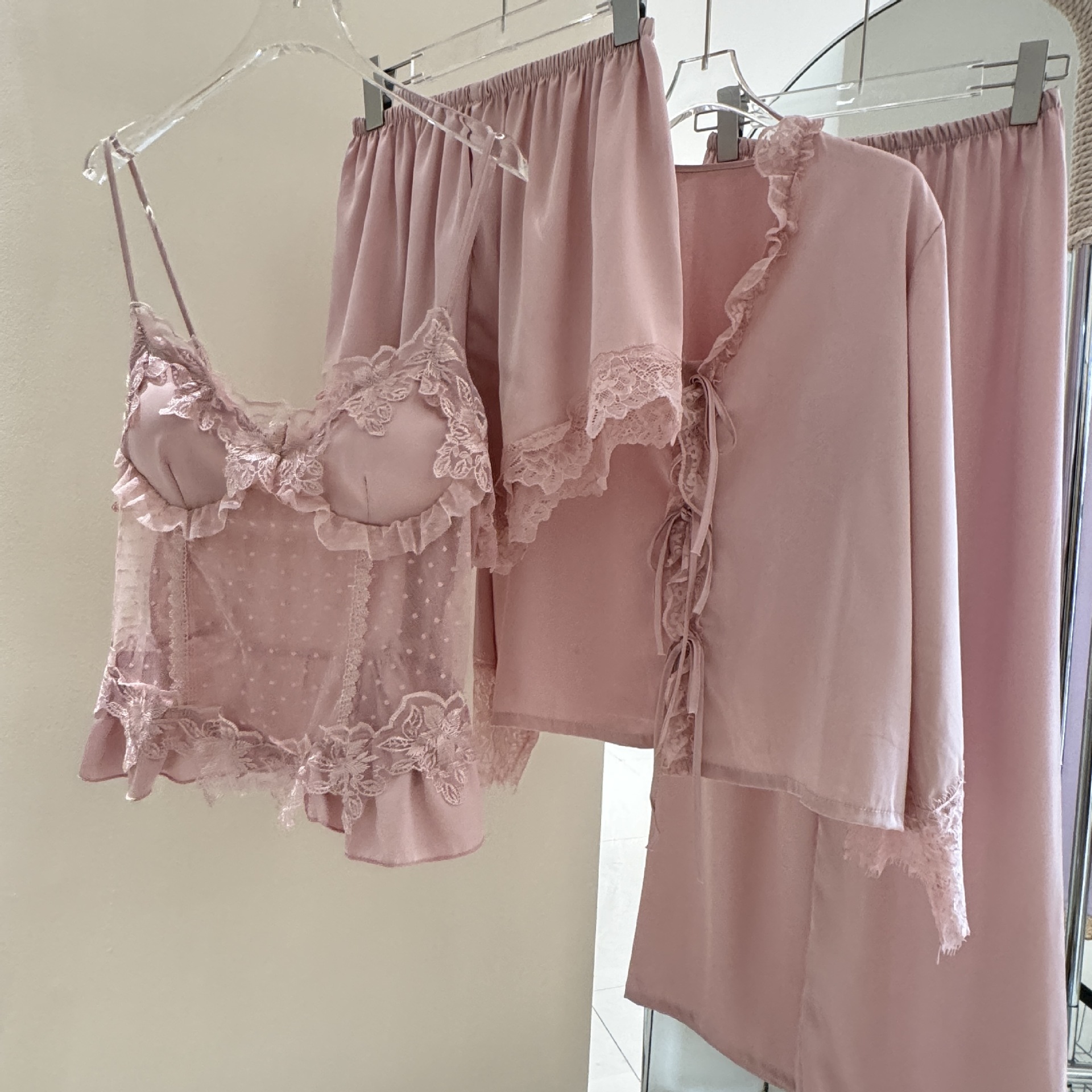 新款 冰丝绸纯欲吊带性感镂空家居服 甜美公主睡衣女四件套春夏长袖