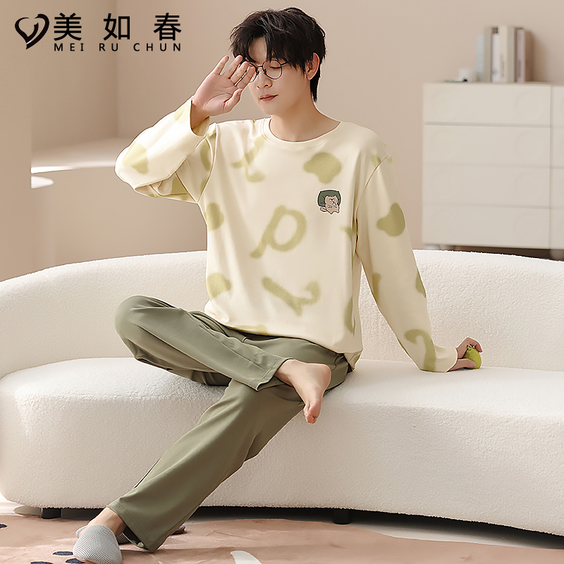 舒适圆领长袖 中厚款 长裤 套装 春秋季 中青年韩版 简约家居服睡衣男士