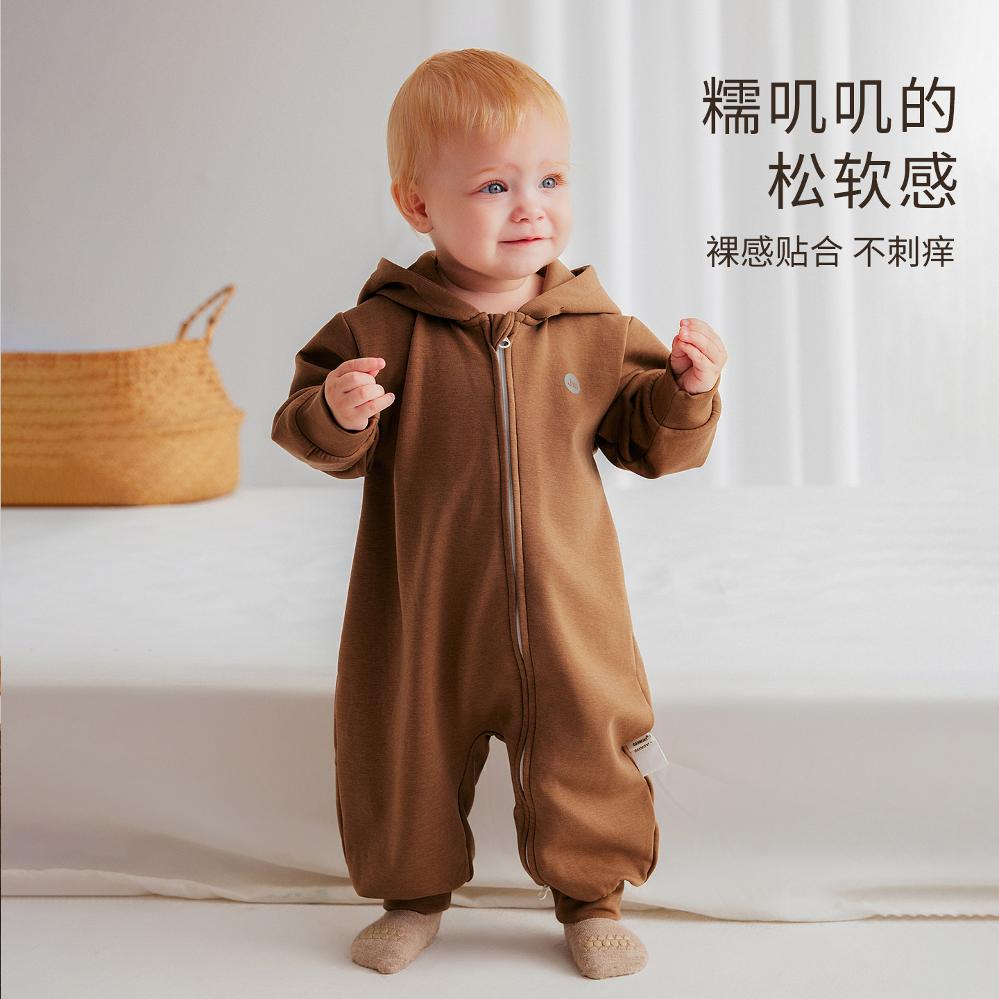 Oak mont婴儿连体衣秋冬宝宝爬服磨毛发热智暖新生儿连帽外出衣服