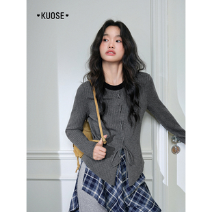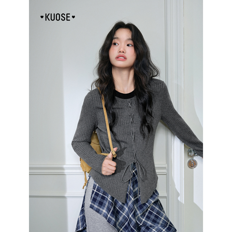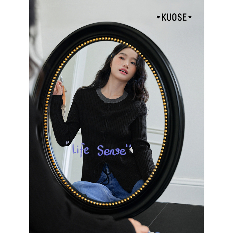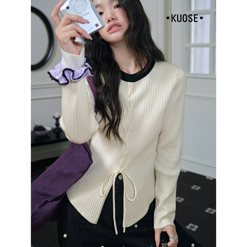 毛衣绑带针织衫 修身 2025秋季 女装 内搭打底上衣黑 新款 阔色撞色长袖