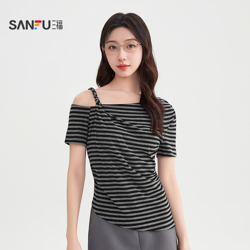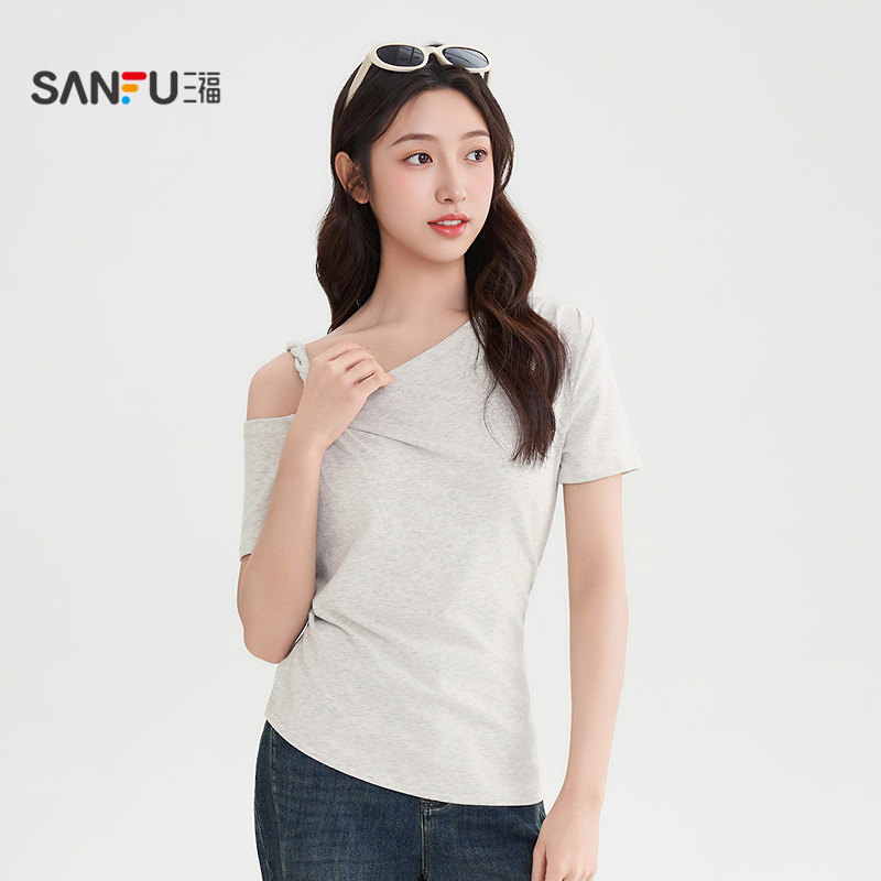 设计感小众扭结肩带斜肩上衣女装 夏季 508622 T恤2025新款 三福短袖