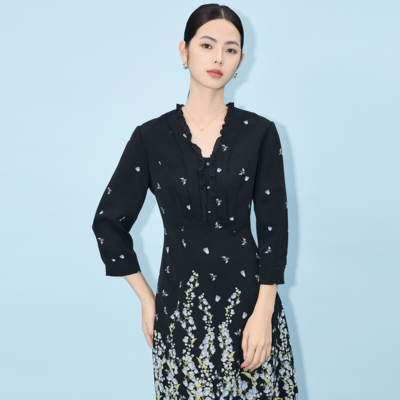 时尚 专柜正品 女装 蓝色印花连衣裙子V领花边收腰长袖 马天奴新款