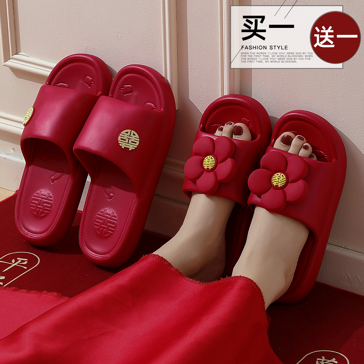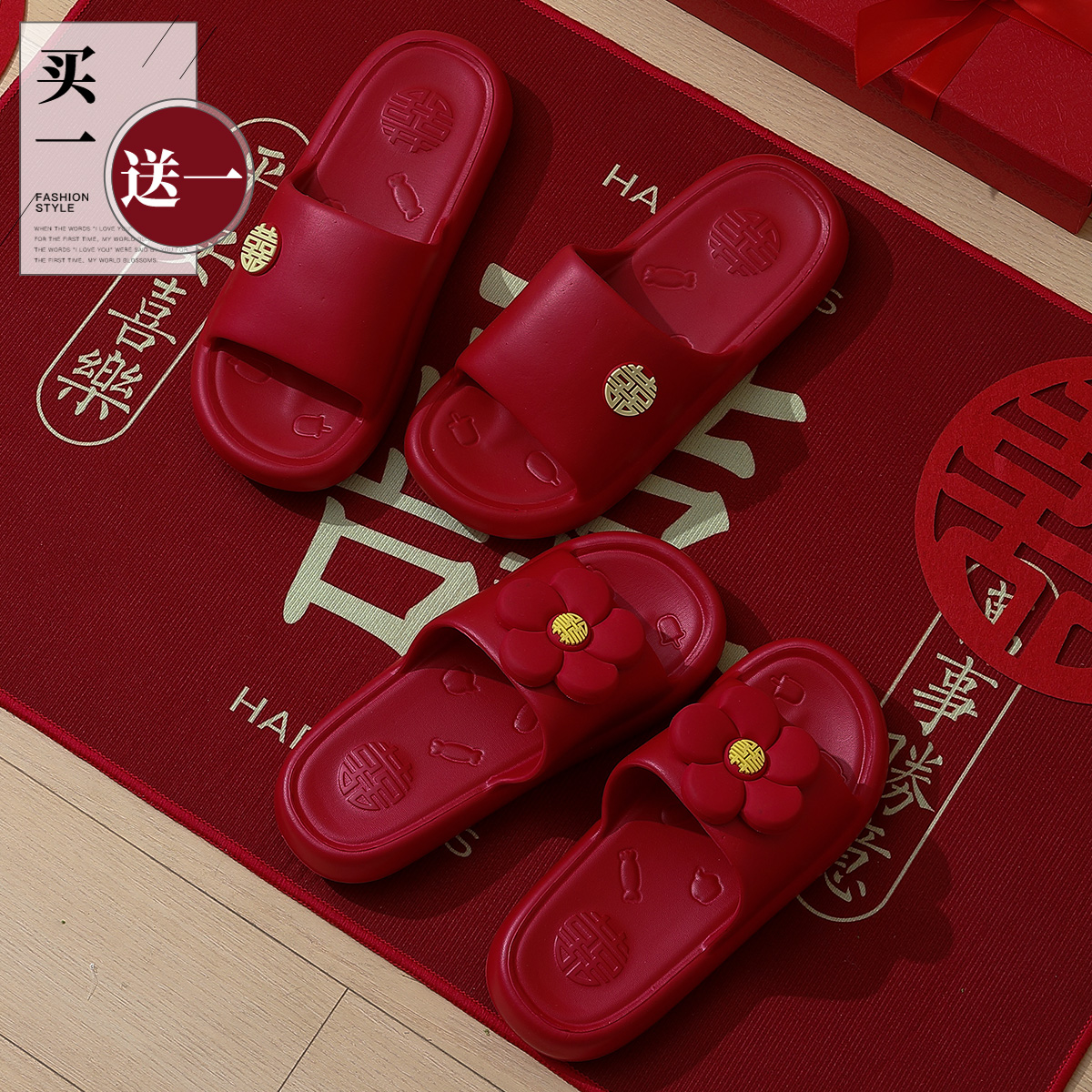 大红色喜庆一对婚庆居家用 结婚拖鞋 买一送一亚麻拖鞋 女夏春秋四季