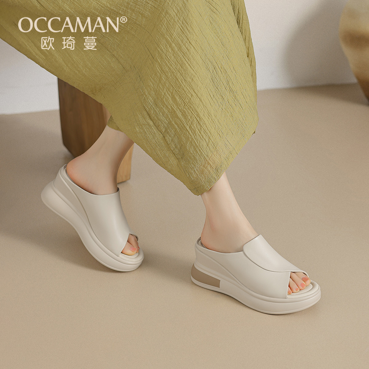 厚底增高松糕一字拖鞋 OCCAMAN 新款 女2025夏季 欧琦蔓真皮坡跟凉鞋
