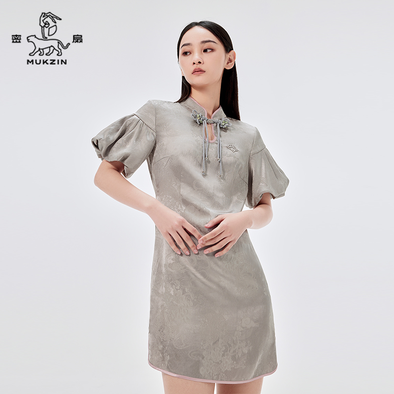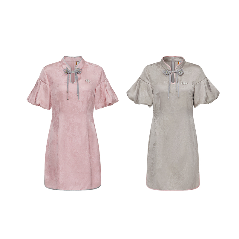 时尚 密扇2024夏季 改良旗袍修身 「金铃」新中式 粉色灰色连衣裙 新款