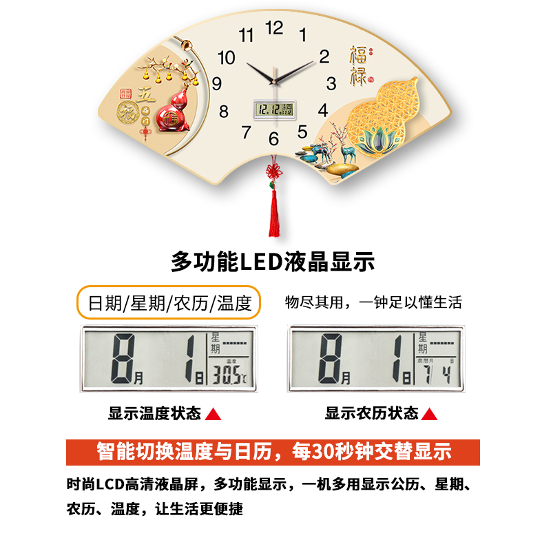 扇形装 饰画客厅挂钟日历中国结家用钟表静音石英简约国风挂墙时钟