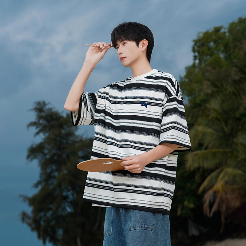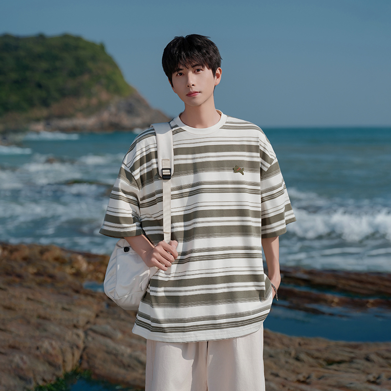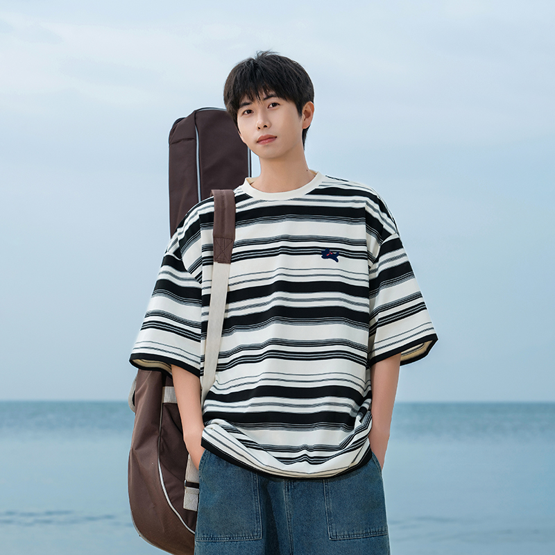美式 新款 宽松体恤情侣上衣 T恤男夏季 迈特优重磅蓝白条纹短袖