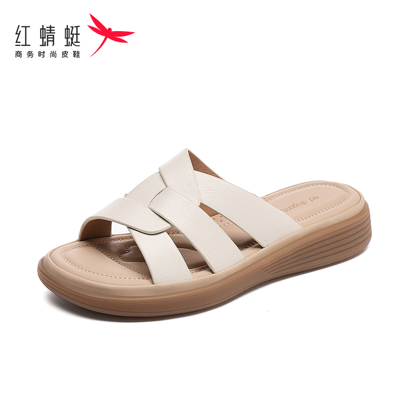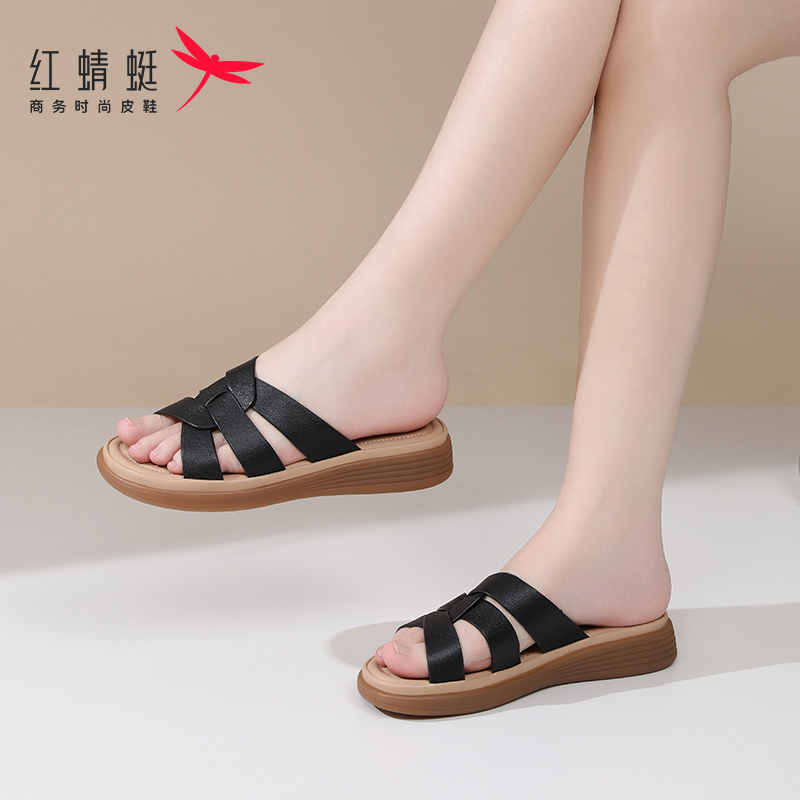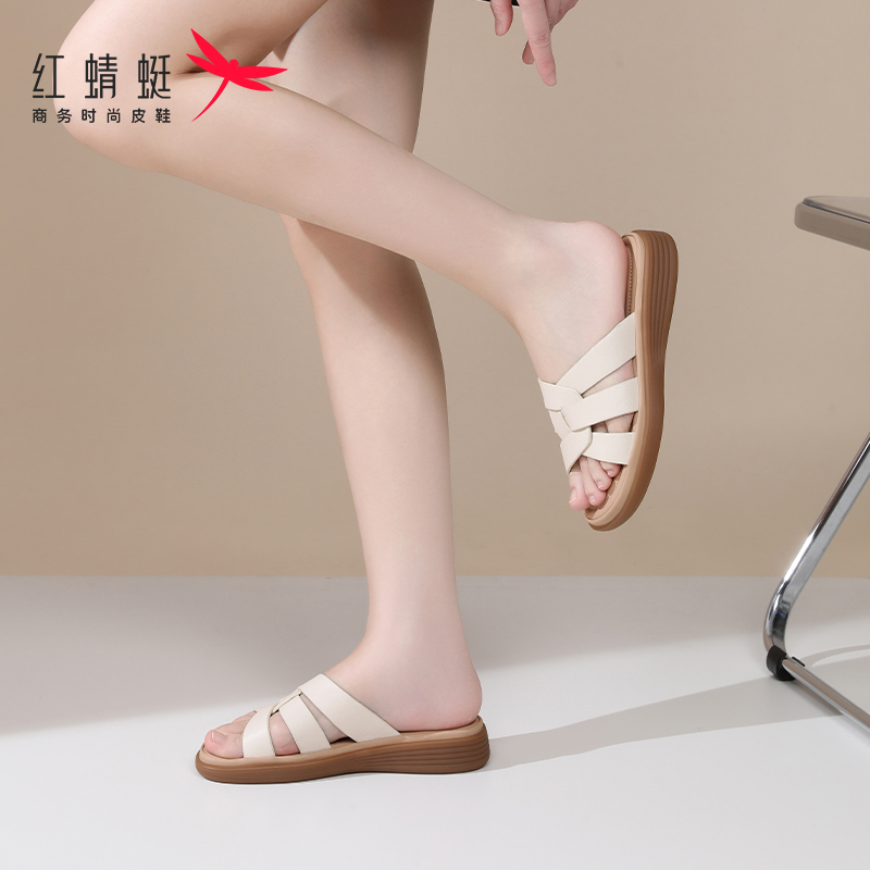 凉拖鞋 外穿夏季 真皮半拖妈妈 女2025新款 红蜻蜓女士平底一字拖拖鞋